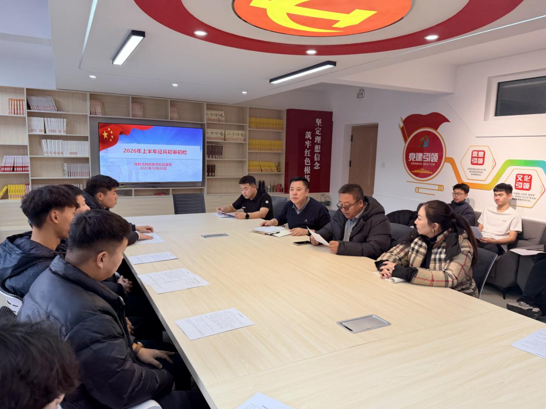 12月26日上午,学校2026年上半年征兵初审初检在二号公寓一楼征兵工作站启动,旨在严把兵员入口关,输送优质兵员。启动会由学生工作部部长常喜主持,相关负责人及报名参军学生参加。常喜强调,征兵工作事关国防建设,要求学生予以高度重视,工作人员须规范履行职责,确保工作过程的公平、公正与公开。征兵工作负责人陈树光全程协调相关工作,详细解读征兵优惠政策,详细解答关于学业保留、退伍安置等方面的疑问,以消除学生的顾...