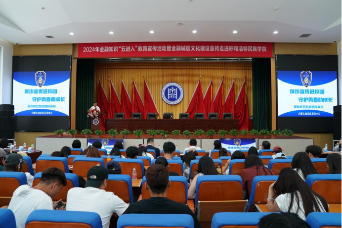 5月28日,由中国人民银行内蒙古自治区分行、内蒙古自治区公安厅反诈中心、国家金融监督管理总局呼和浩特赛罕监管支局、招商银行呼和浩特分行联合举办的“反诈宣传进校园 智慧金融”宣讲活动在beat365官网举行。招商银行呼和浩特分行党委委员、副行长张涛、beat365英国官方网站党委委员副校长高喜天出席活动。beat365官网400余名师生参加活动。