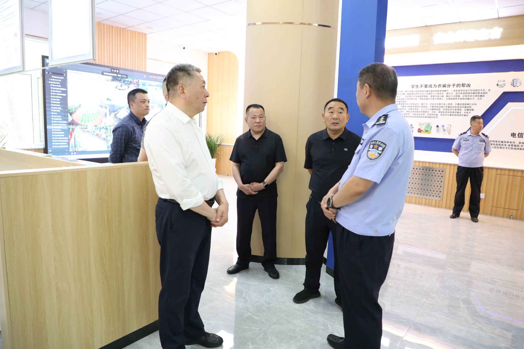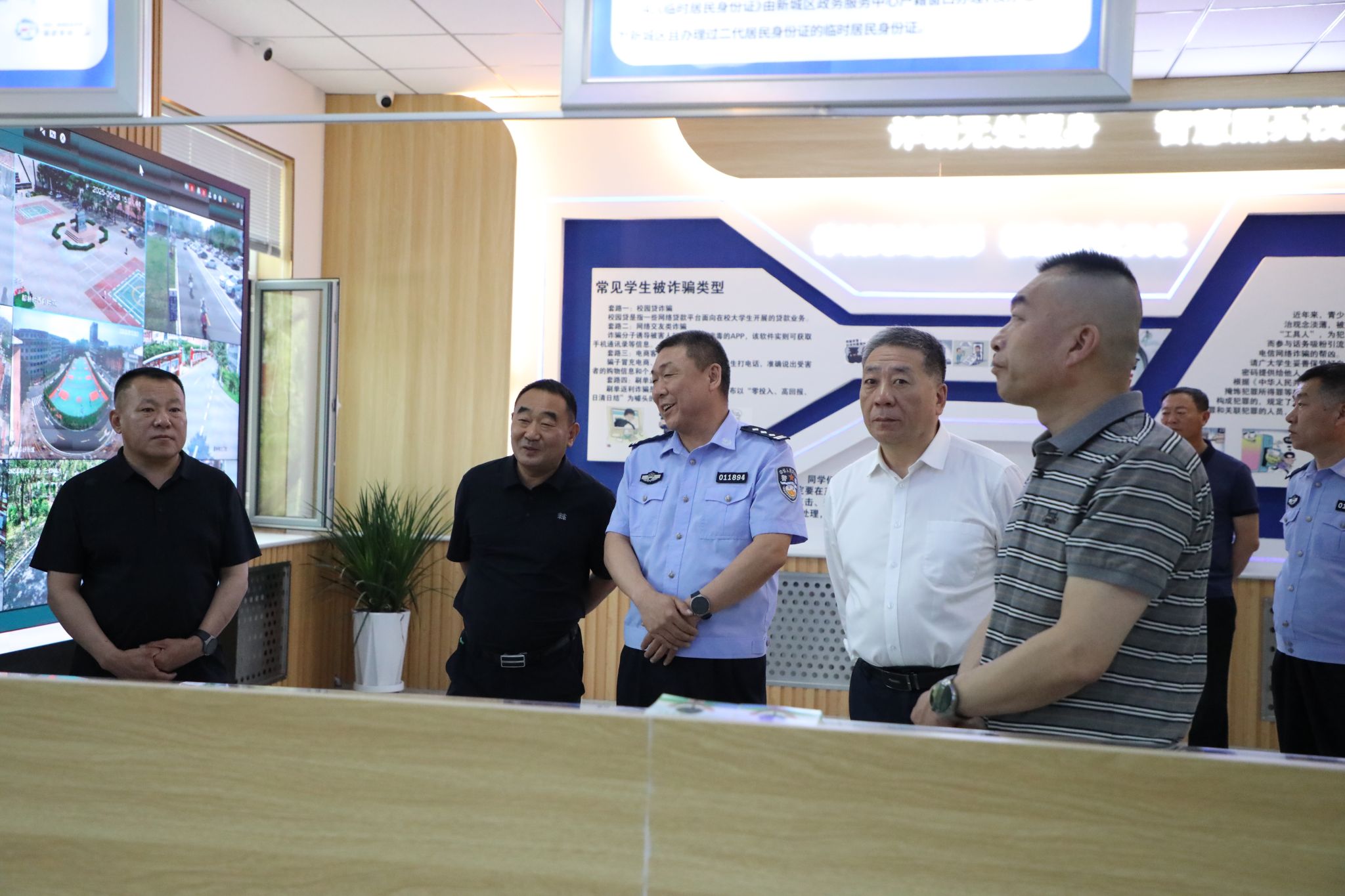 调研组一行参观了学校警务室宣传、服务、调解中心三大职能板块以及“警务室-监控中心”实时智慧联动平台,详细了解了各功能区域配套设施设备及整体运行情况,着重调研了应急处置、校警联防联控、安全教育、服务师生等方面工作的具体情况。随后,调研组与beat365官网安全管理处、警务室相关人员就学校标准化警务室建设及校警高效联动工作模式展开深入研讨。交流中,调研组对beat365官网校警高效联动的安全管理创新工作模式给予充分肯定。