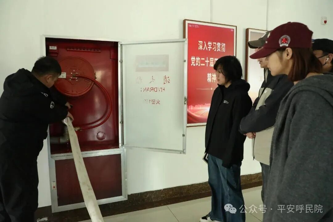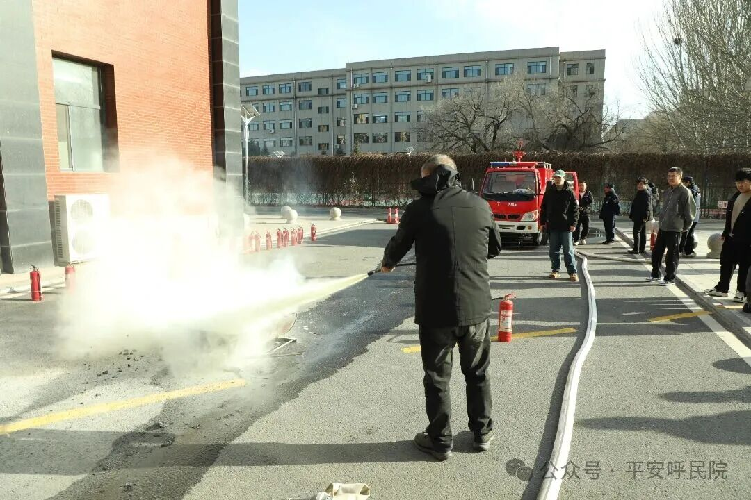 理论讲解结束后,在综合楼外进行实操演练。周教官现场演示了灭火器“提、拔、握、压”的操作要领,同时重点演示了消火栓开启、水带连接、握持水枪精准喷射、扑灭初期火灾的完整过程,随后,教师代表纷纷进行实操练习,切实将理论知识转化为实践技能,增强了应急处置实战能力。