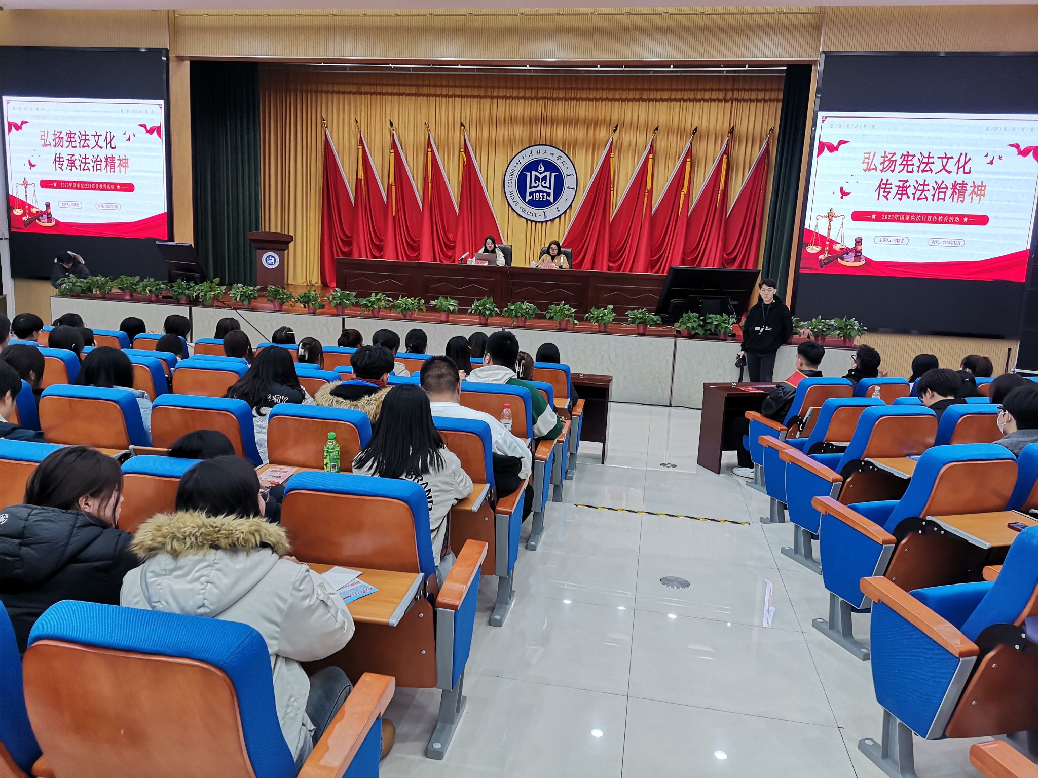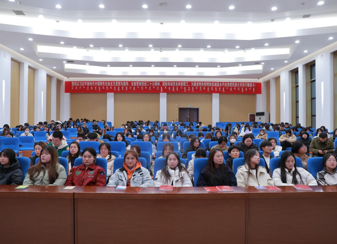 为认真学习宣传贯彻党的二十大精神,贯彻落实习近平法治思想和习近平总书记关于宪法法治教育的重要指示精神,12月5日,学校在学术报告厅举办了“大力弘扬宪法精神,建设社会主义法治文化”主题讲座,本次活动由新城区司法局与学校党委宣传部、保卫处共同主办,法学院承办。法学院党总支书记乌兰其其格主持讲座,各学院师生代表300余人参加讲座。