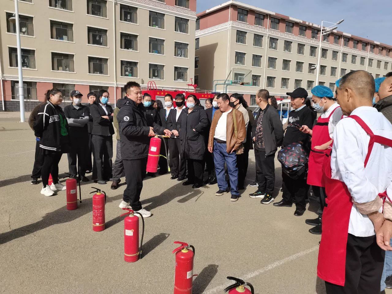 随后,在10号公寓南侧空地开展灭火应急演练。技术人员现场演示了各类消防器材的正确使用方法,包括灭火器、灭火毯等。培训人员积极参与体验操作消防器材,进一步掌握如何在紧急情况下迅速有效扑灭初期火灾。