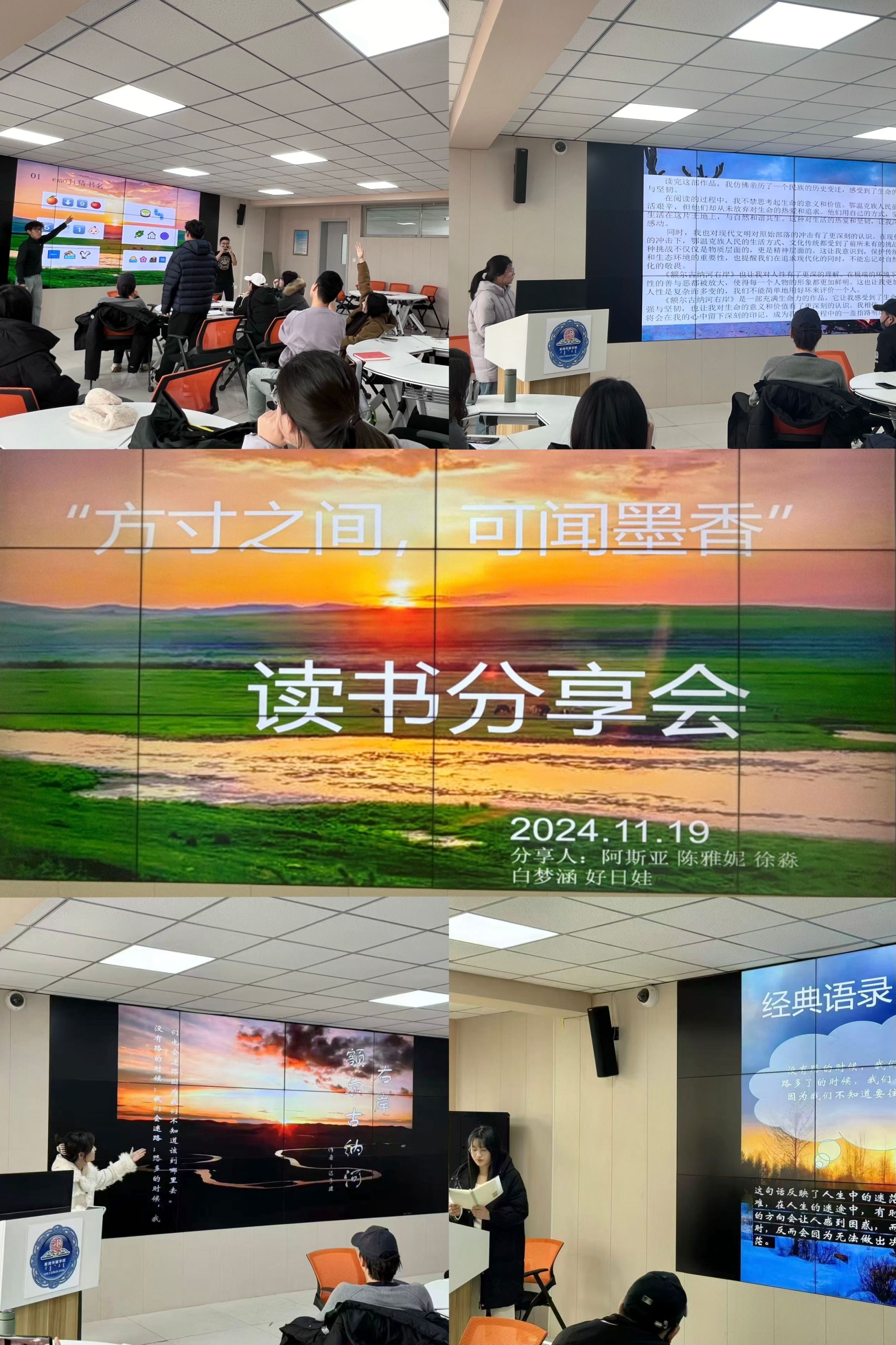 本次活动由第一组五位同学精心策划并组织,主题为“方寸之间,可闻墨香”。他们选择了迟子建的经典之作《额尔古纳河右岸》作为分享书籍,通过五个环节的设计,带领大家深入领略这部作品的独特魅力。