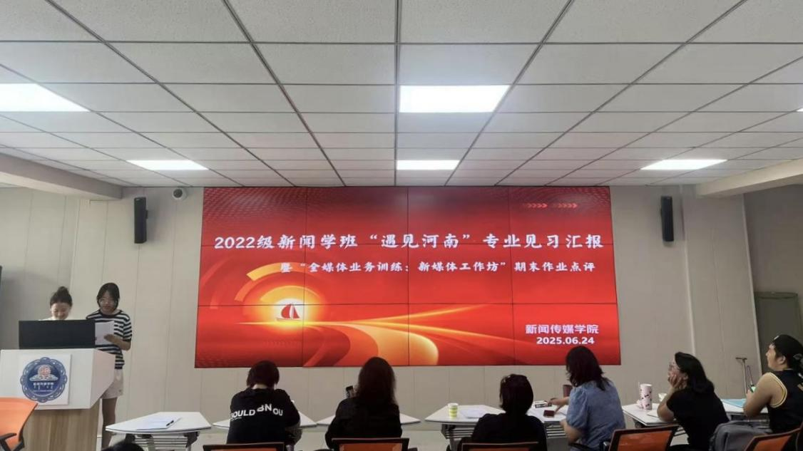 6月24日,新闻传媒学院2022级新闻学班在都林楼314教室举办“遇见河南”专业见习汇报暨“全媒体业务训练”课程期末成果展评会。活动由原内蒙古广播电视台新闻中心摄像部主任包金花、学院教师王高娃、图亚担任评委,以“教考分离”形式现场打分并逐一点评。