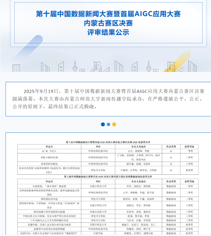 云升、梁峻峰、李超同学创作的《AI MV 守村人》荣获大赛内蒙古赛区一等奖;于文静、岳丽娟、王智慧、阿力马、陈玮玮、图诺木拉同学创作的《彩虹小熊的礼物》荣获二等奖;潘宇鑫、张露、伍南伶同学创作的《重复的致命配送》荣获三等奖。所有获奖作品均由梁翠莲、阿特尔、王倩茹三位老师共同指导。