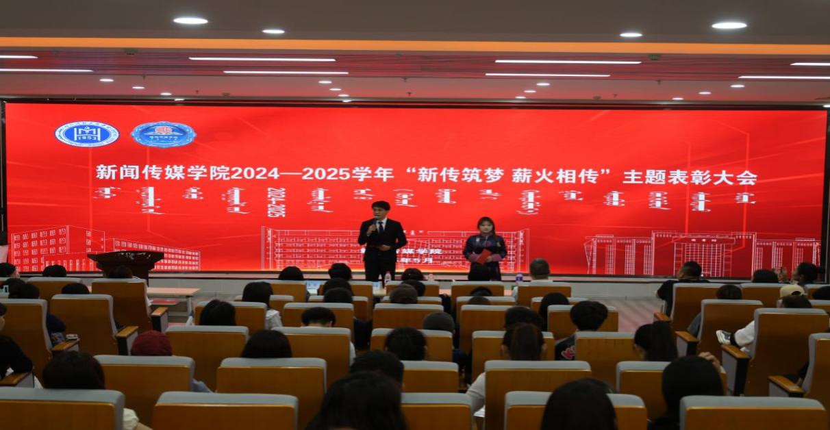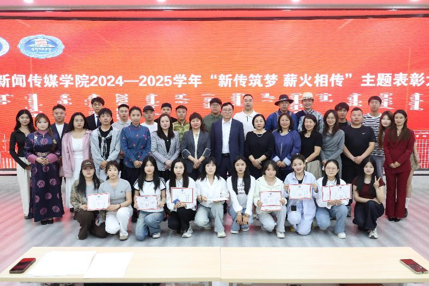 5月26日晚,新闻传媒学院“新传筑梦 薪火相传”主题表彰大会在北院图书馆一楼报告厅举行。学院党总支书记苏伦高娃、院长额尔敦毕力格、党总支副书记王丽、副院长安迎春,以及专业教师、班主任、辅导员、获奖学生代表共150余人参加。