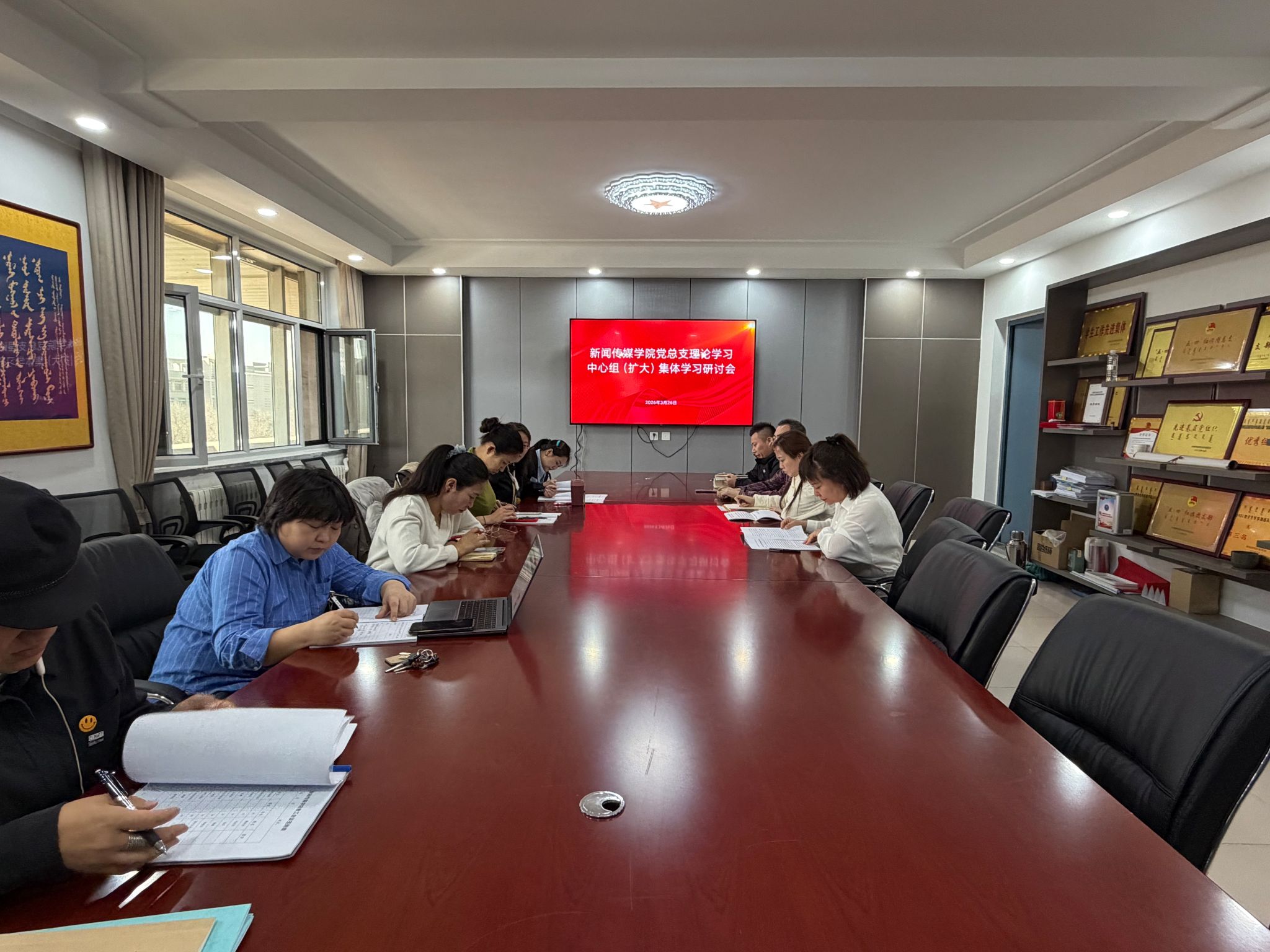 3月26日上午,新闻传媒学院党总支召开理论学习中心组(扩大)学习研讨会,会议由党总支书记苏伦高娃主持,全体党员教师参加。