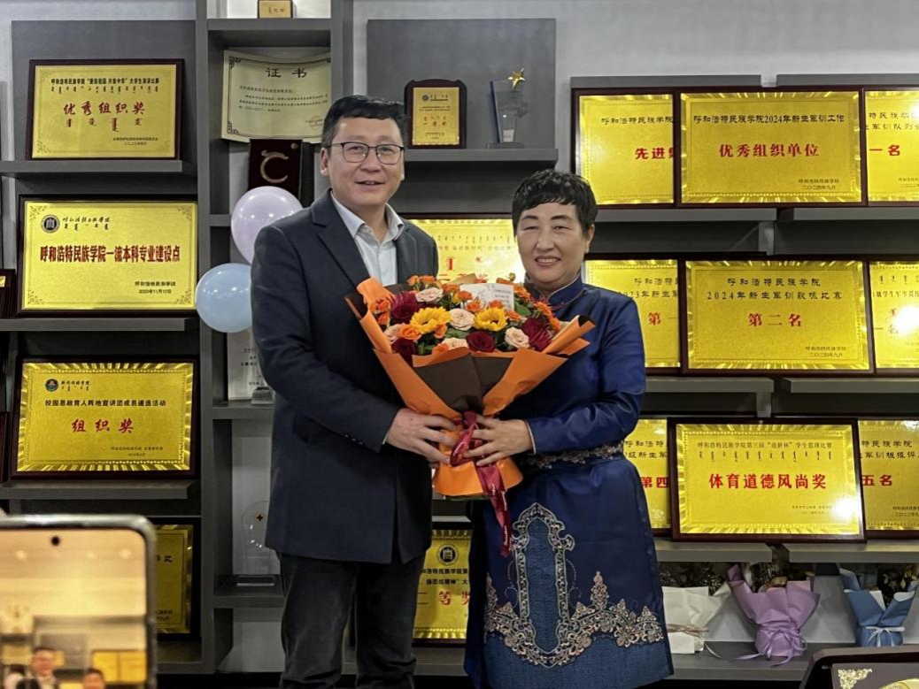 仪式上,院长额尔敦毕力格对白塔娜教授在学院学科建设、人才培养所做出的卓越贡献表示诚挚感谢。白塔娜教授分享了与学院共度的难忘时光,对学院精心策划的荣休仪式表达感谢,她深情回顾了在学院度过的三十四载春秋,言语间流露出对学校的深厚情感。同时,她向新入职的教师赠送了暖心礼物,并致以诚挚的祝福。