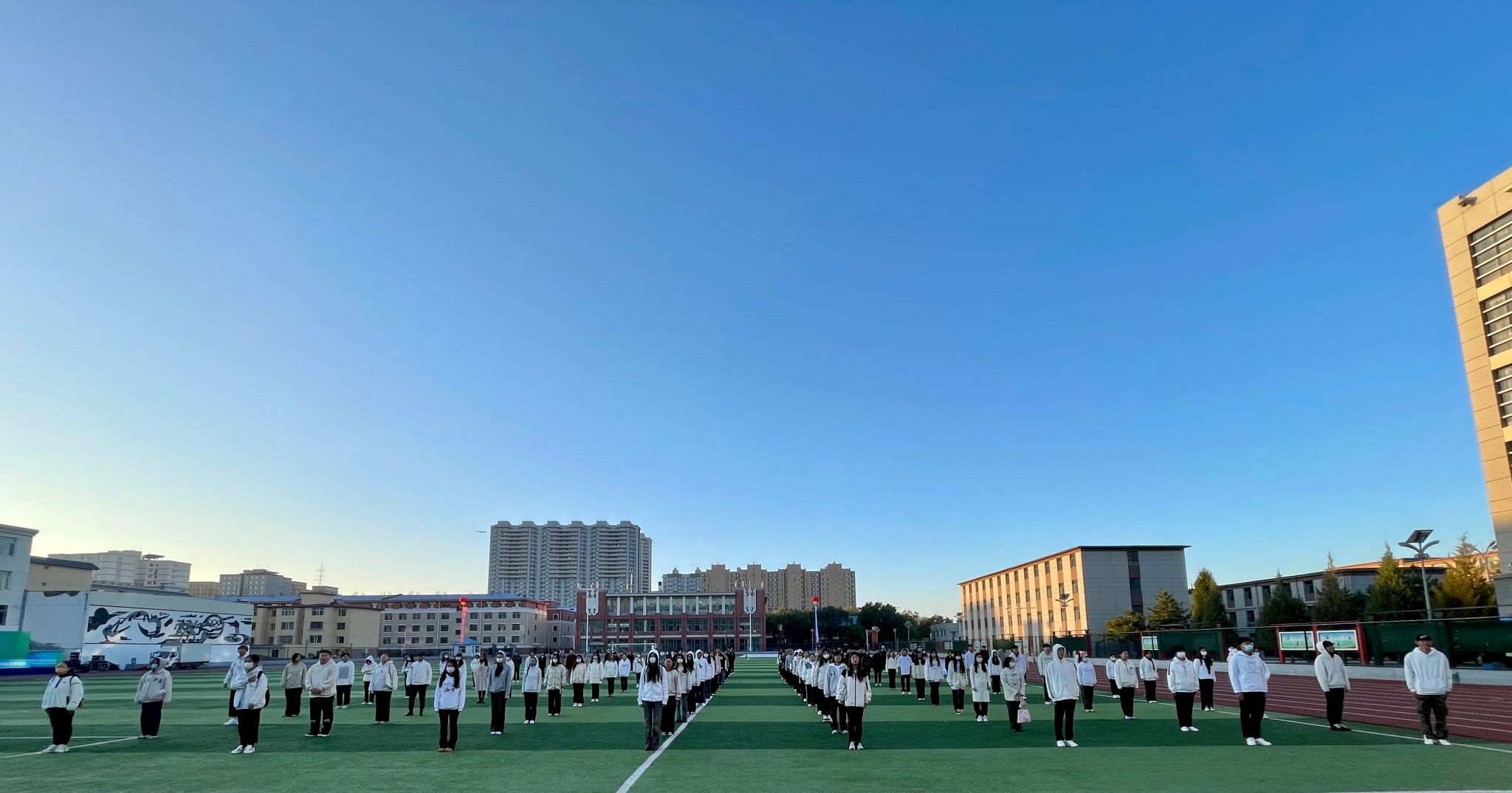 2023年10月9日早上6点,新闻传媒学院在南苑操场组织进行了《民族团结心向党,携手共进新未来》主题升国旗活动,149人参加此次升国旗活动。