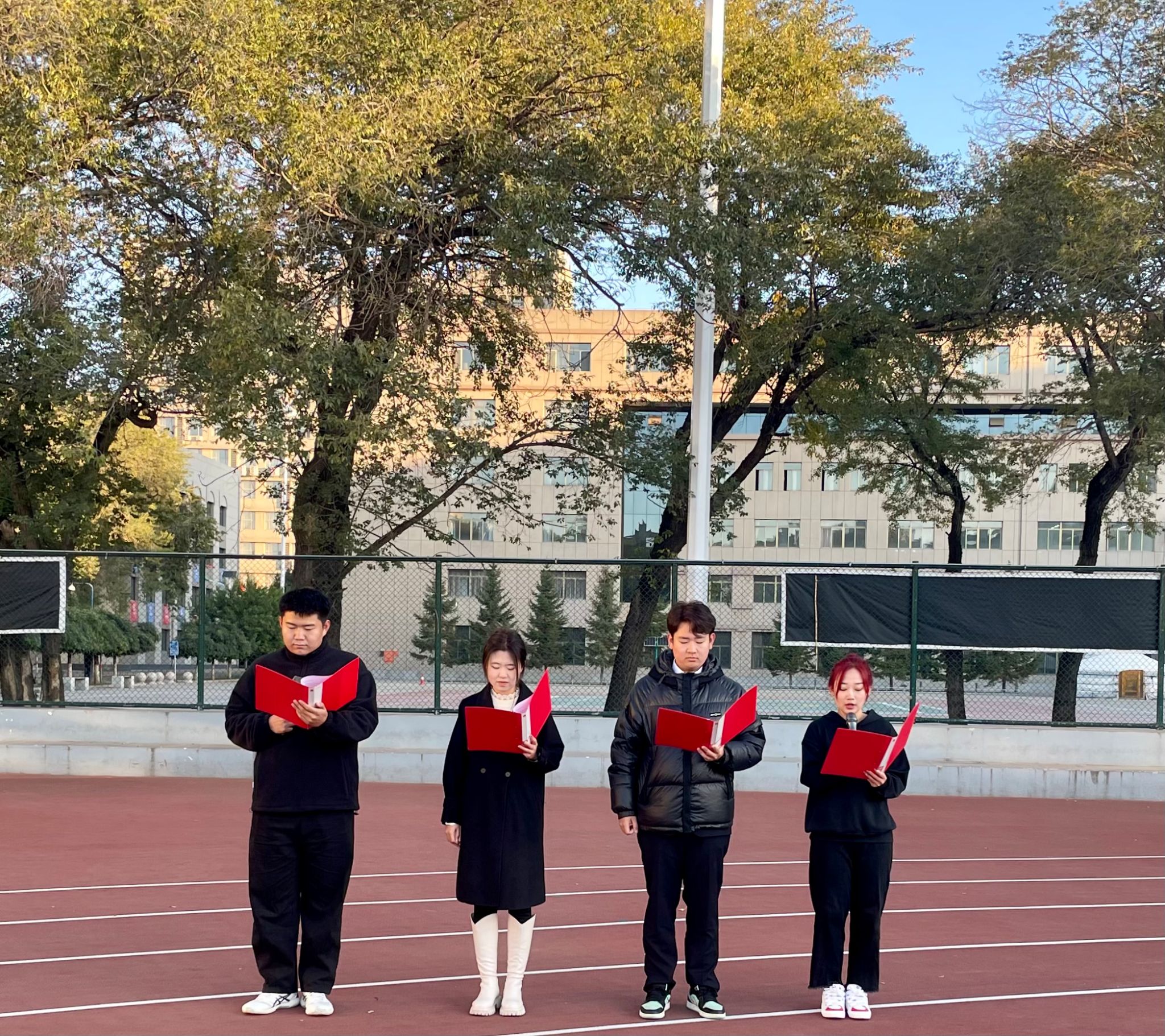 升旗仪式结束后,2023级新闻传媒学院新闻班的霍启光和播音班的石延祺、刘禹萱、董昱彤同学代表新生进行国旗下演讲,充分抒发了民族团结心向党,携手共进新未来的情感。