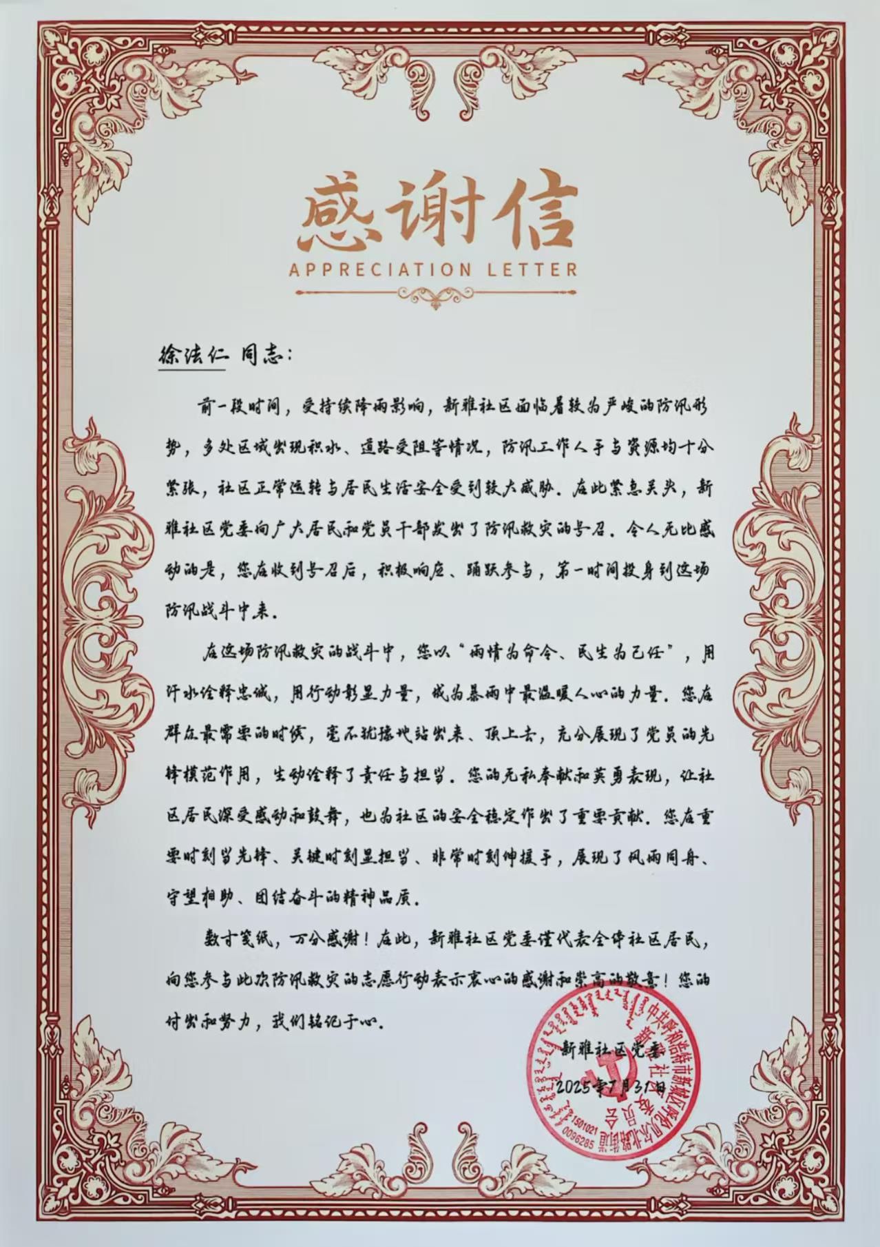 7月25日、26日,受强降雨影响,呼和浩特市区多处区域出现积水、道路受阻等情况,部分社区居民生活安全受到较大威胁。汛情就是命令,徐法仁同志第一时间响应社区紧急招募志愿者通知,冒着仍未停止的大雨迅速赶到现场,投身当地防汛工作,为社区防洪抗灾和安全稳定做出了突出贡献,展现出一名党员干部高度的社会责任感和无私的奉献精神。