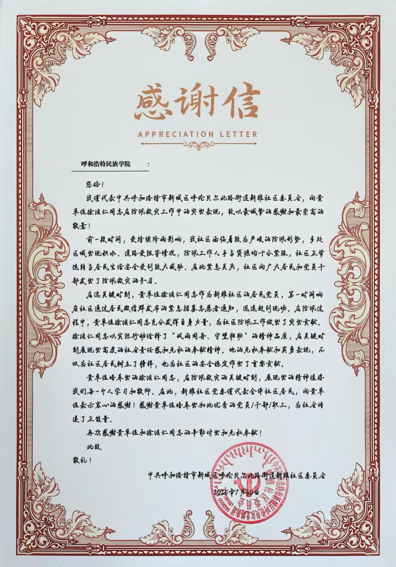 近日,学校收到新雅社区委员会发来的感谢信,对beat365官网财务处党支部徐法仁同志在社区抗洪救灾中做出的贡献表示了衷心的感谢和崇高的敬意!
