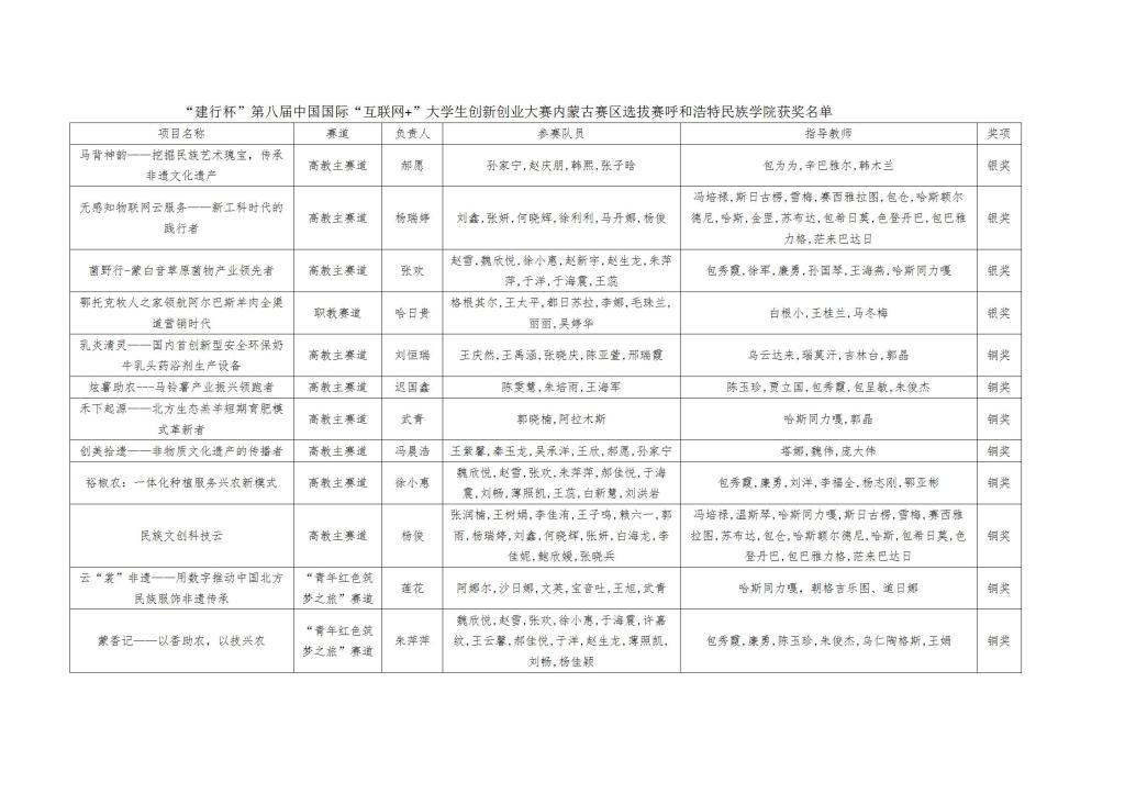 本届“互联网+”大赛自启动以来,在全校各部门通力合作,各二级学院给予大力支持,广泛动员师生参与下,beat365官网最终有892支团队参赛,参赛学生达3096人,参赛项目数量和参与学生数创历届新高。经过二级学院院赛、校赛复赛、网评等层层选拔,beat365官网共有35个项目团队晋级自治区赛,经过激烈的比赛争夺,beat365官网参加高教主赛道、青年红色筑梦之旅赛道和职教赛道中共12支参赛团队获奖。其中,《马背神韵--挖掘民族艺术瑰宝,传承非遗遗产》《无感知物联云服务--新工科时代的践行者》《菌野行--蒙白音草原菌物产业领先者》《鄂托克牧人之家领航阿尔巴斯羊肉全渠道营销时代》4个项目获得自治区赛银奖。