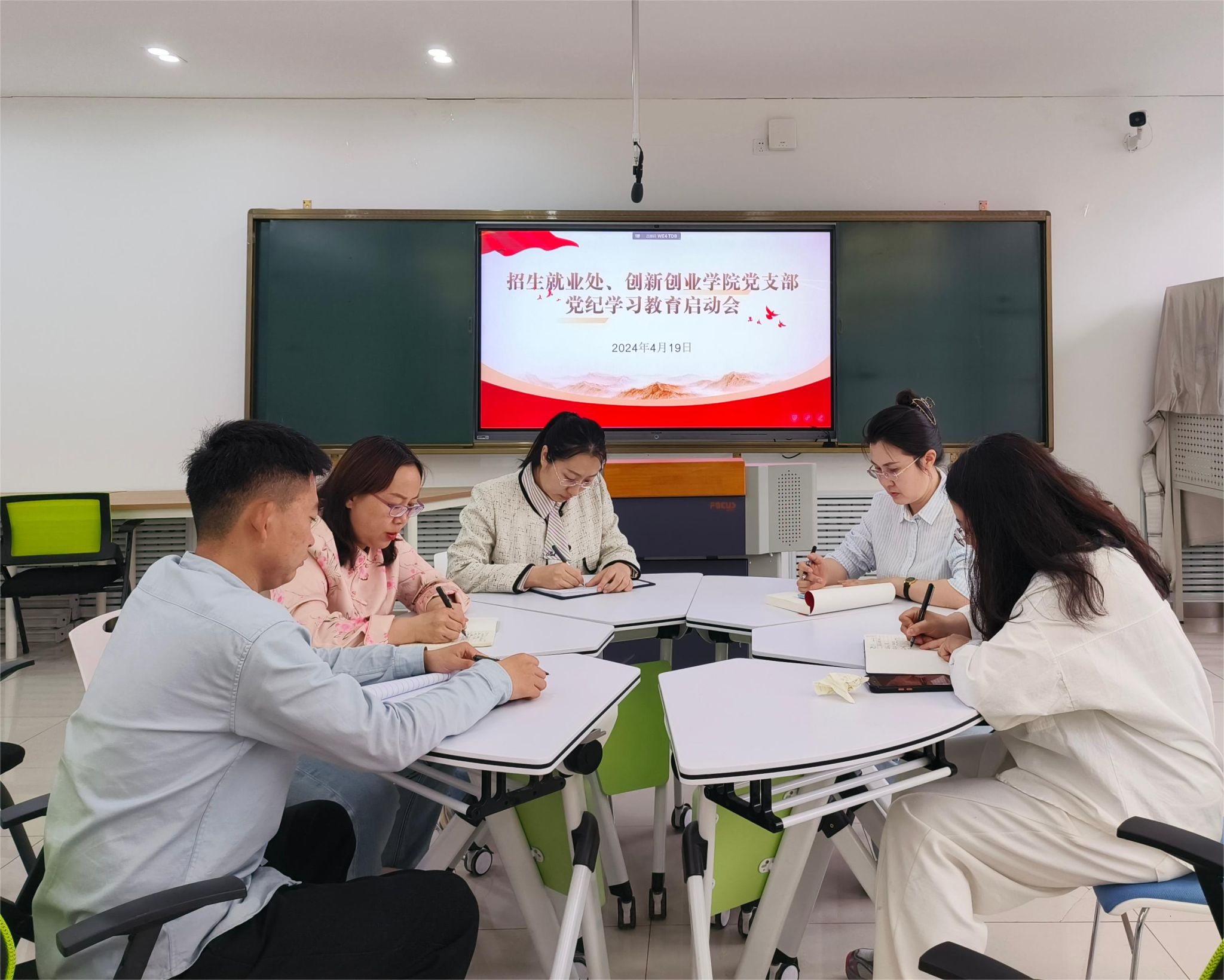 4月19日下午,招生就业处、创新创业学院党支部在创业楼307室召开党纪学习教育启动会。会议由支部书记佟繁荣主持,支部全体党员参加。