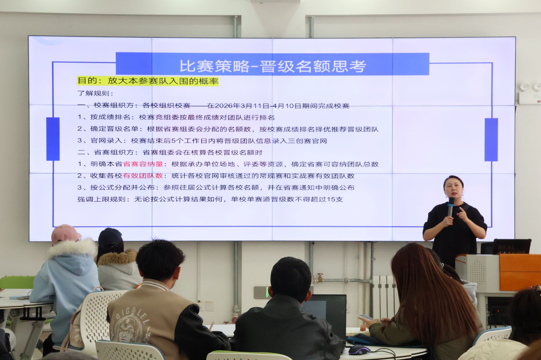 此次培训充分践行了学校“以赛育才、产教融合”的育人理念,有效夯实了参赛师生的备赛基础,明确了备赛思路,为校赛顺利开展提供了保障。未来,我中心将持续跟踪各团队备赛进展,组织项目问诊、优秀案例分享研讨等活动,为参赛师生提供专业化指导与全方位资源支持,助力师生在本届“三创赛”中取得优异成绩。