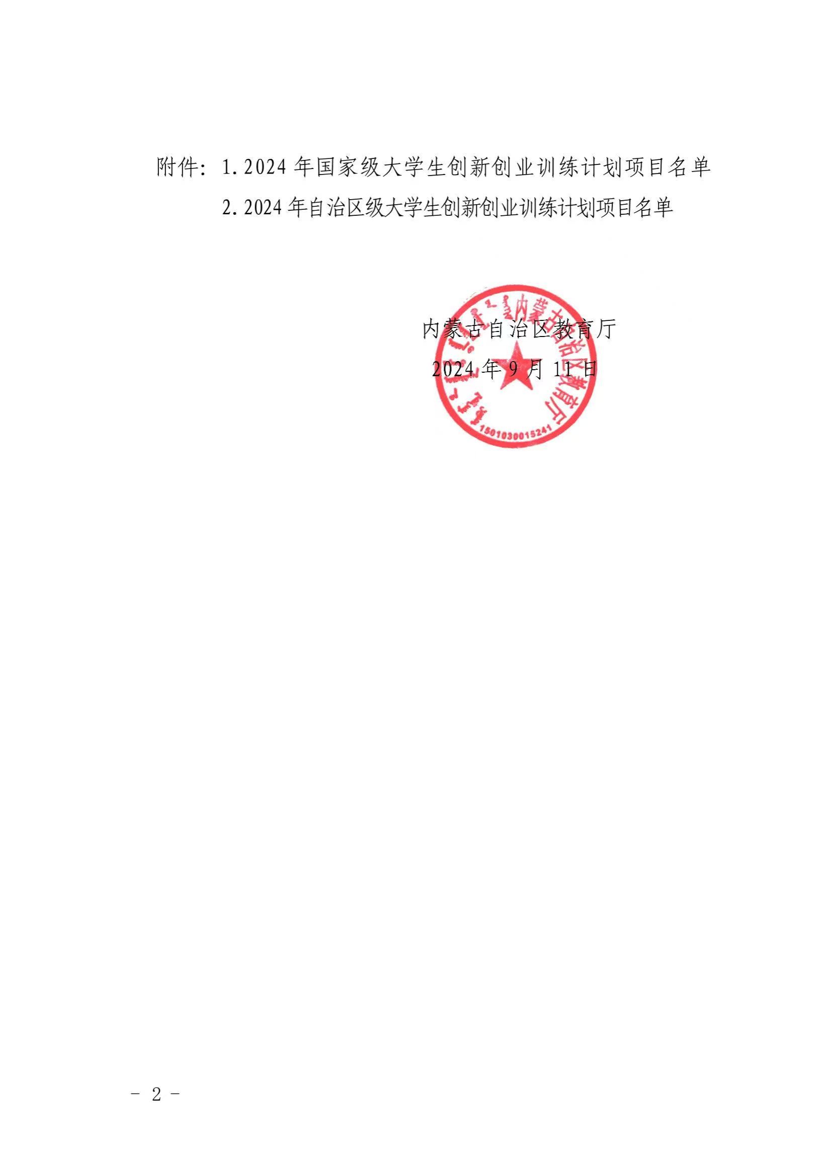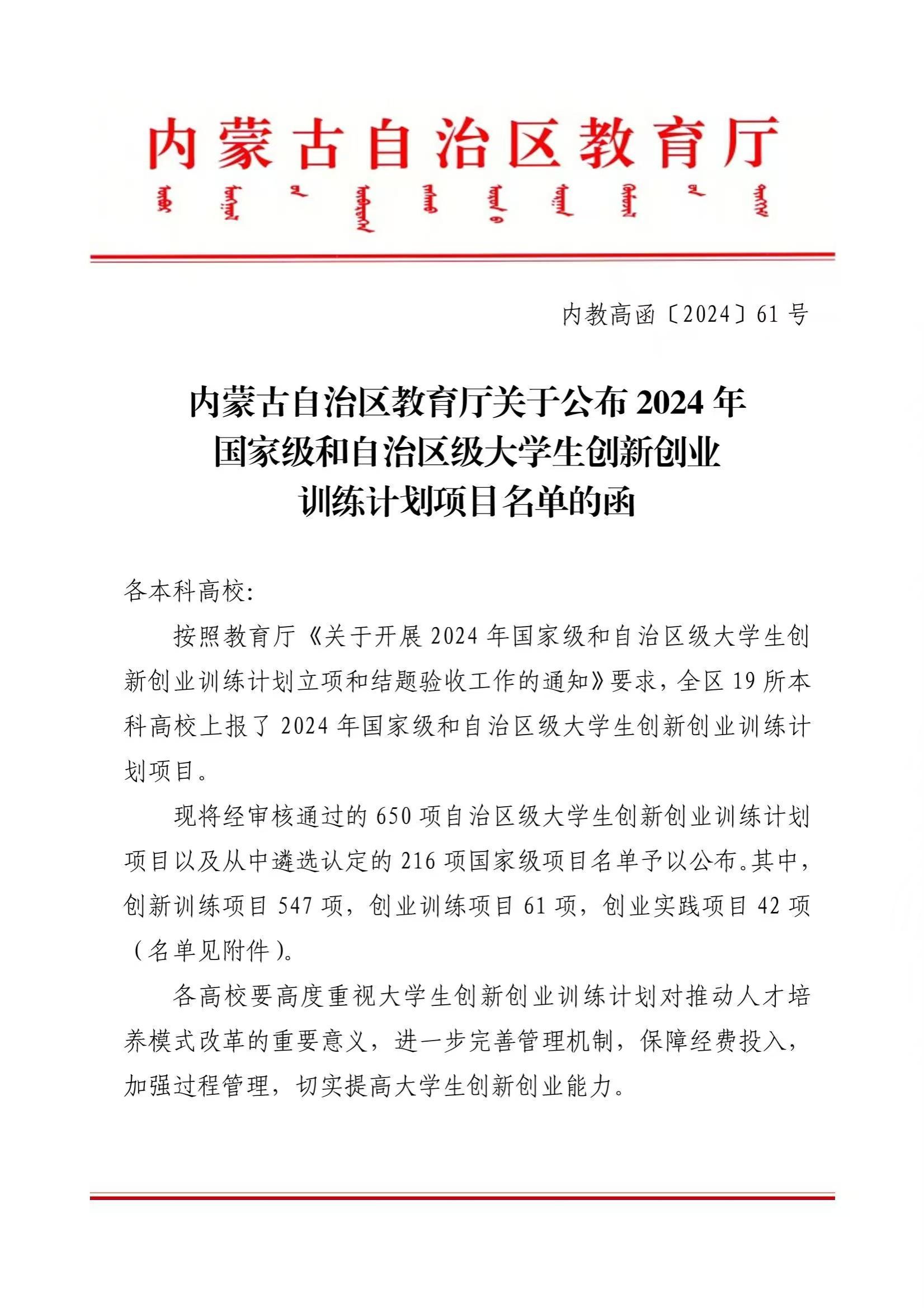 内蒙古自治区教育厅关于公布2024年国家级和自治区级大学生创新创业训练计划项目名单的函