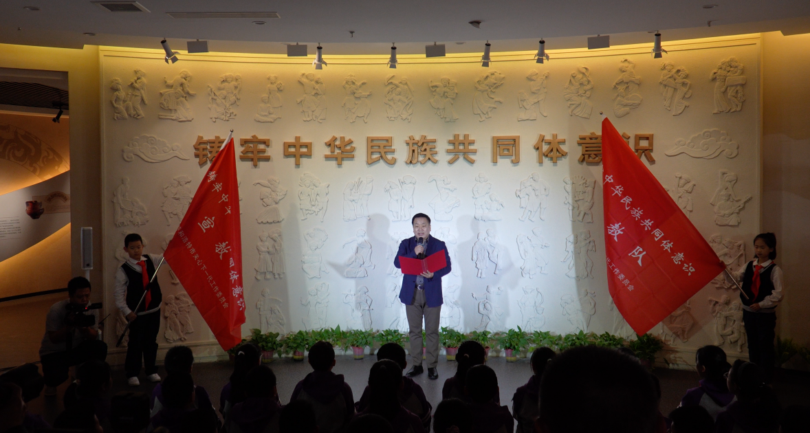 揭牌仪式后,进行了“铸牢”馆里启“铸牢”宣教活动。活动聚焦馆教一体、馆创一体、馆演一体,邀请“五老”讲解团,即“老马说马”博主马智聪,讲述马镫的起源、演变及历史作用;邀请历史文化学者、老旧城人曹建成,讲述从战国云中古城到呼和浩特,城市几次更名和背后不同历史时期的交往交流交融史实;邀请大型交响诗画《我愿以身许国》老创作人,讲述中国精神谱系中的“两弹一星”精神;邀请土生土长的额济纳人、老教授殷俊海,讲述内蒙古额济纳旗人民为支持航天事业“三易旗府”的故事;邀请内蒙古民族艺术剧院演员芒来和绿地小学学生吴非凡共同演绎《额济纳河的诉说》主题短剧,通过爷孙对话展现额济纳旗人民“最好牧场让航天”,舍小家为大家的爱国情操。活动中,春蕾第一小学学生孙婉然还表演了手风琴独奏《红星歌》,五一班全体同学共同朗诵了《少年中国说》,表达了同心共筑中国梦的决心。