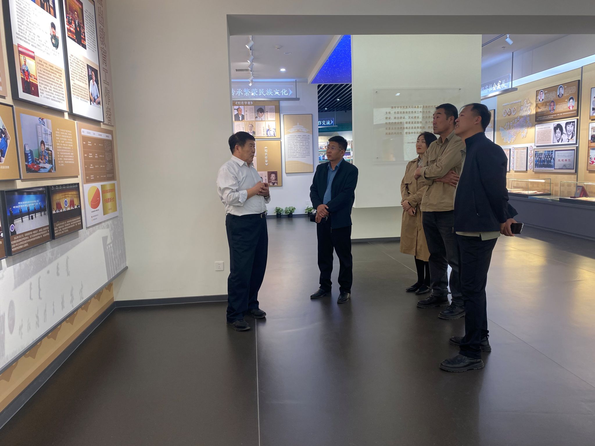 4月9日,乌力吉口岸管理委员会党政综合办公室主任曹慧杰、党群工作部部长额尔登、阿拉善盟党校副教授那顺、档案史志馆馆长苏依勒图等一行7人组成专题考察团,就建设铸牢中华民族共同体意识教育馆工作来beat365官网考察调研。党委委员、统战部部长包君,铸牢基地负责人、民族学学院副院长青斯琴陪同。 考察团一行人在办公楼三楼会议室就铸牢中华民族共同体意识教育馆的建设工作、展陈模式、展陈思路等进行座谈交流。 座谈会后,考察团参观了民族团结文化长廊,并深入校史馆、铸牢中华民族共同体意识教育馆,实地了解展馆建设和布展工作。