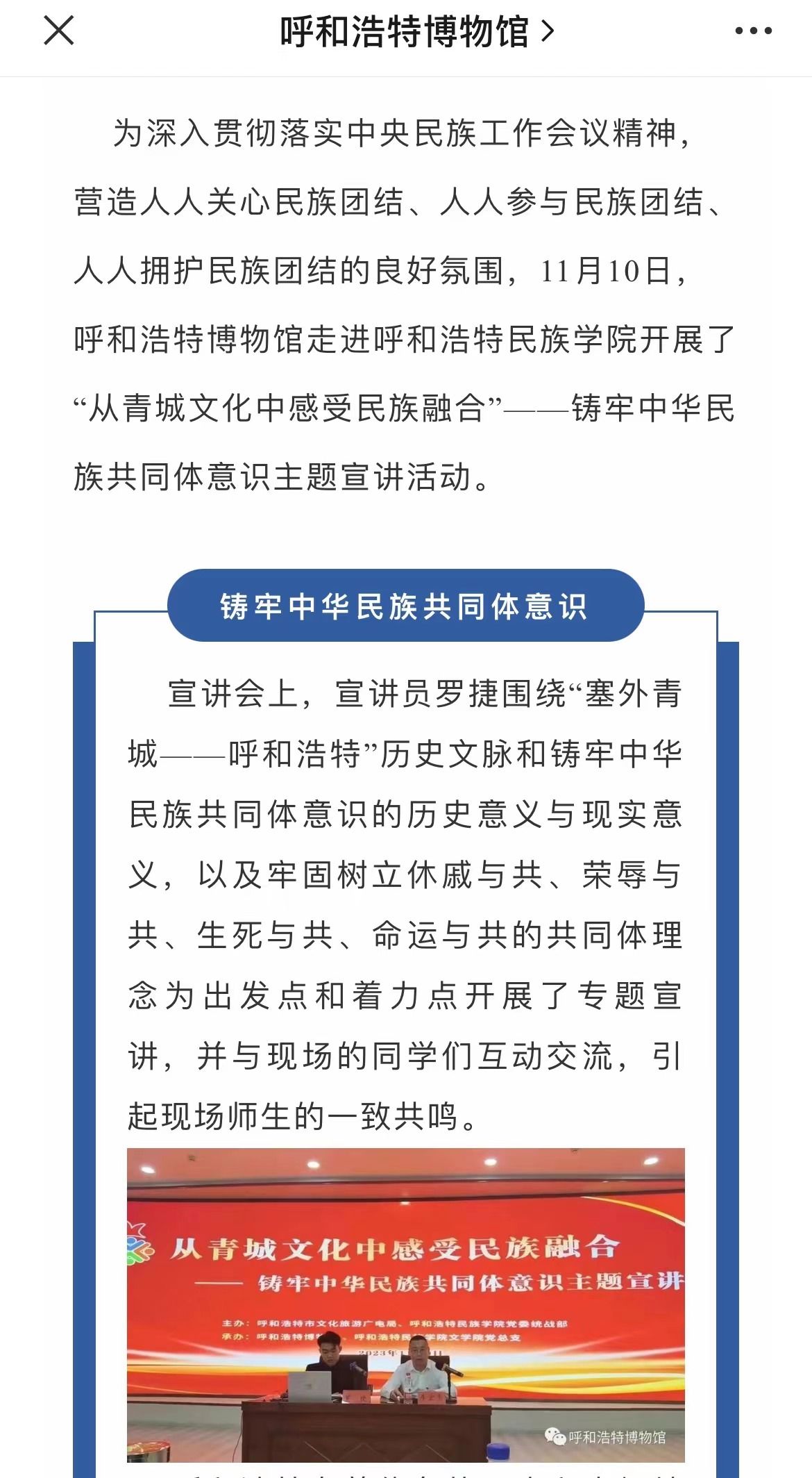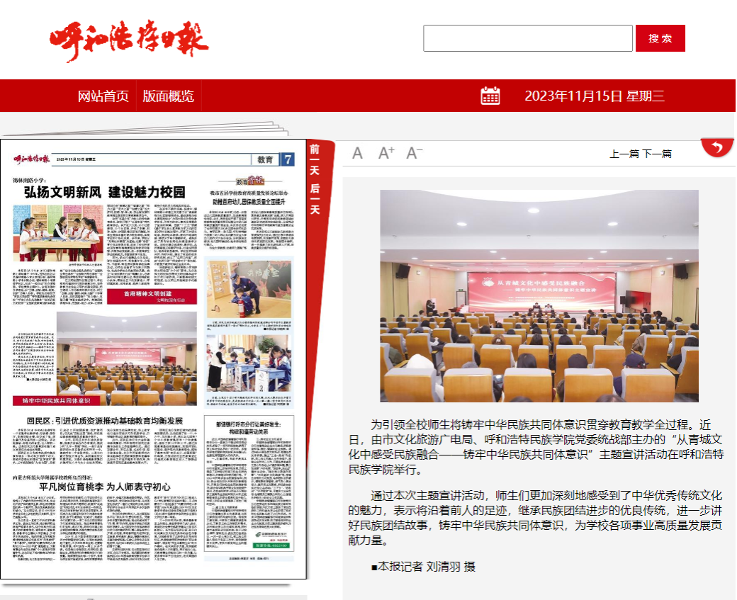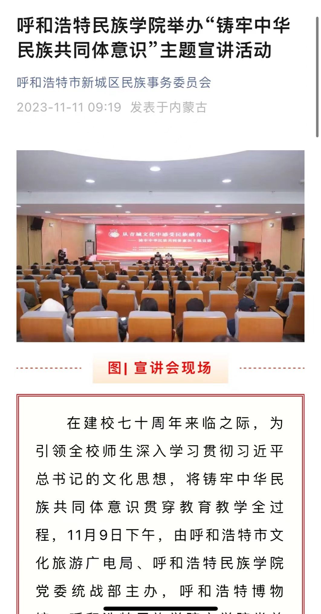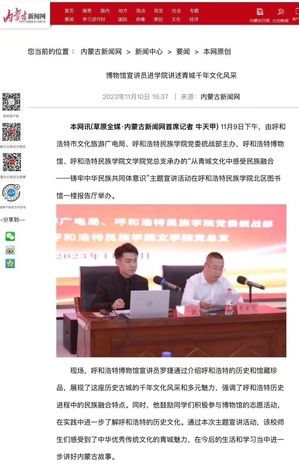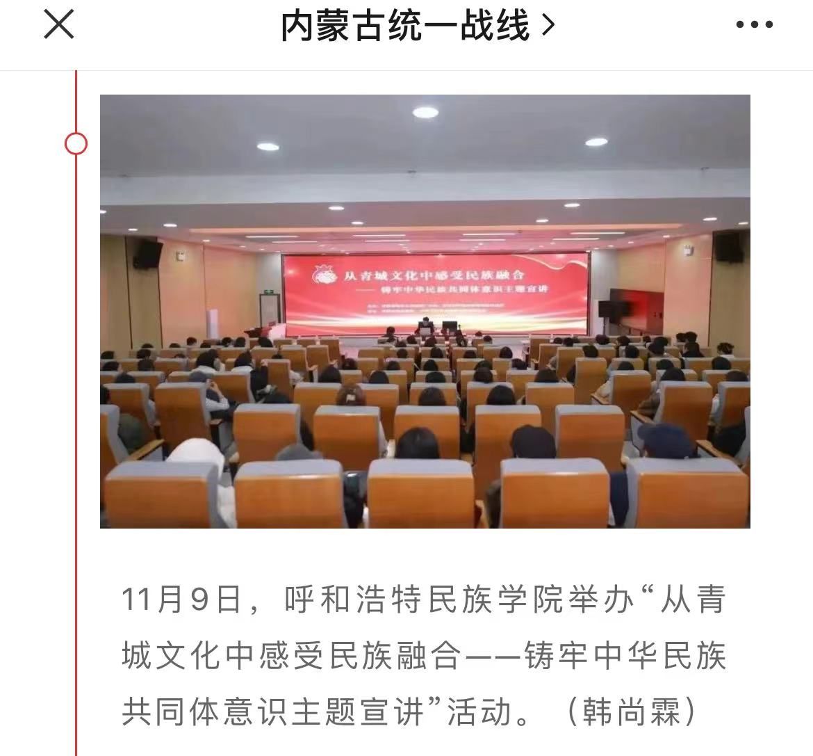 11月9日下午,由呼和浩特市文化旅游广电局、beat365英国官方网站党委统战部主办,呼和浩特博物馆、beat365英国官方网站文学院党总支承办的主题宣讲活动在北区图书馆一楼报告厅举办。活动受到社会各界的广泛关注和大力宣传。截至目前,共有中新网、内蒙古新闻网和内蒙古党委统战部官微、呼和浩特博物馆官微、呼和浩特新城区民族事务委员会官微等6家校外媒体对本次活动进行了宣传报道。