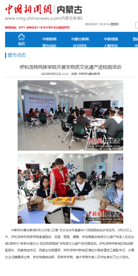 在第40个民族团结进步活动月,学校开展了系列活动,其中9月20日举办的“传承非遗文化 促进民族团结”非遗文化进校园活动,因内容丰富、形式新颖、特色鲜明,经学校积极与媒体联系,持续受到社会各界的广泛关注和大力宣传。其中,新华网客户端的报道刊发3小时,即达到15万人次的点击量。