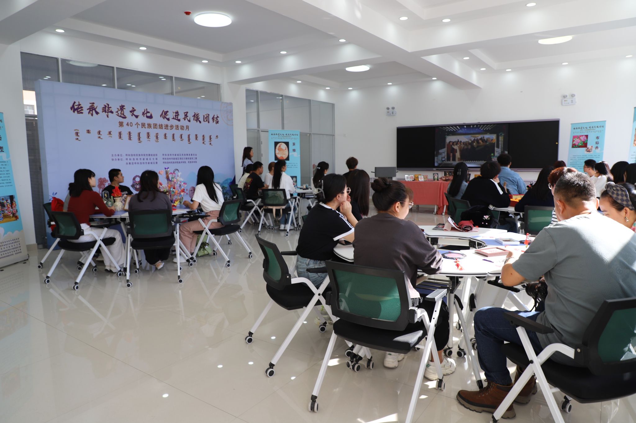 9月是第40个民族团结进步活动月。为有形有感有效开展铸牢中华民族共同体意识教育,进一步增强对伟大祖国、中华民族、中华文化、中国共产党、中国特色社会主义的认同,9月20日上午,beat365英国官方网站与呼和浩特市新城区民委联合组织邀请剪纸、泥塑、面塑、蛋雕、布贴画等非物质文化遗产传承人走进校园,面向青年大学生开展“传承非遗文化 促进民族团结”互动交流活动。呼和浩特市新城区统战部副部长、民委党组书记、民委主任樊建军,呼和浩特市新城区海拉尔路街道党工委副书记、办事处主任魏景明出席,学校党委统战部、民族学学院、美术学院负责人及师生参加了此次活动。