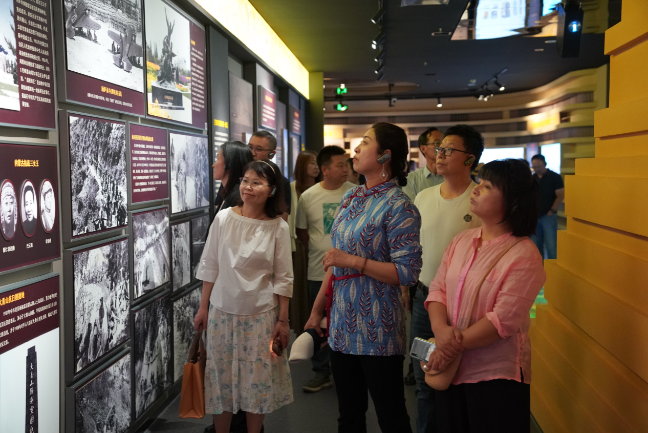 留联会一行首先参观了学校铸牢中华民族共同体意识教育馆。展览内容以习近平总书记提出的“铸牢中华民族共同体意识,就是要引导各族人民牢固树立休戚与共、荣辱与共、生死与共、命运与共的共同体理念”重要思想为指引,以铸牢中华民族共同体意识为主线,以《中华民族共同体概论课》为参照,以各民族交融汇聚的中华民族共同体的起源、形成和发展为脉线,以沉浸式的中华民族共同体时空隧道、艺术浮雕、数字投影、答题测试、历史照片和珍贵展品等多种形式,综合展示多元一体的中华民族形象和命运共同体的伟大历程,具有较高学术性、专业性、权威性和综合性。