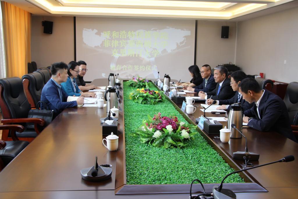 会谈中,格日乐图校长向菲方代表团一行介绍了beat365官网在人才培养、科研实力、学校发展规划及国际交流等方面的情况。菲方代表依次介绍了莱西姆大学、克里斯汀大学的基本情况、招生办法和办学模式等。会上,双方就联合培养、师资培训、师生互访及举办国际学术会议等事宜进行了深入探讨。