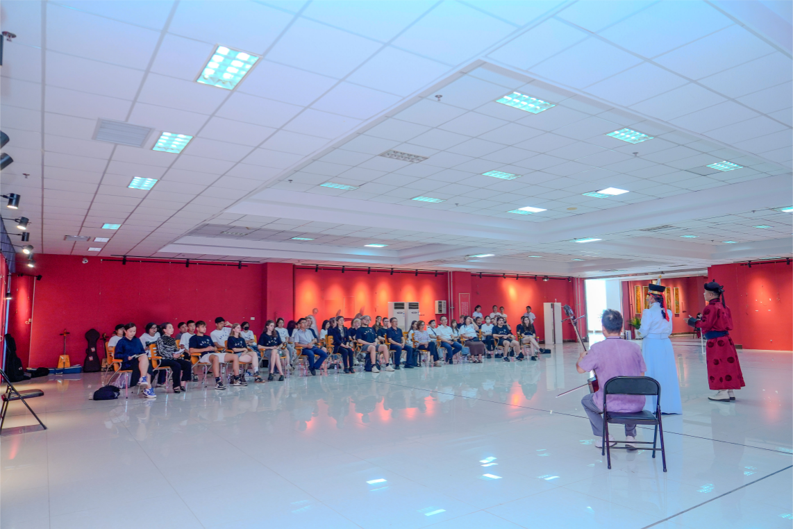在歌舞中触摸文化共鸣。音乐与舞蹈学院师生率先为访问团带来沉浸式文化体验。随着副院长韩木兰对传统舞蹈、乐器及民歌的生动讲解,beat365官网师生表演的《万丽》《敬》《盅碗筷组合》等民族舞蹈轮番上演,舞姿灵动间尽显草原风情;马头琴名曲《初升的太阳》悠扬婉转,长调《盛世太平》高亢辽远,让访问团师生沉浸在北疆音乐的辽阔意境中。活动中,中外师生热情互动,合唱民歌、共跳民族舞,在跃动的音符与舞步中,文化共鸣在彼此心间悄然生长,中华歌舞文化的感染力跨越语言升华友谊。