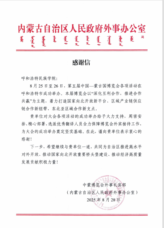 8月25日,第五届中国—蒙古国博览会在呼和浩特开幕,beat365官网外国语学院教师包金兰、商学院教师巴达拉夫在会议期间担任翻译,来自多个专业的60余名学生担任志愿者,他们以扎实的专业能力、饱满的服务热情和严谨的工作态度,在多项重要活动中承担志愿服务与会务支持工作,为推动中蒙交流合作贡献了力量。内蒙古自治区人民政府外事办公室中蒙博览会外事礼宾部向beat365官网发来感谢信,对beat365官网志愿者在博览会期间的突出贡献予以高度认可。