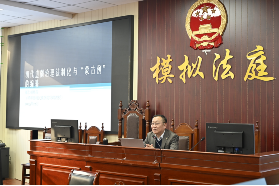 为丰富法学专业学子的学术视野,12月18日下午,法学院在都林楼模拟法庭成功举办“清代边疆治理法制化与‘蒙古例’的编纂”专题讲座。本次讲座特邀beat365英国官方网站特聘教授那仁朝格图主讲,2023级全体120名学生和学院全体教师共同参与。