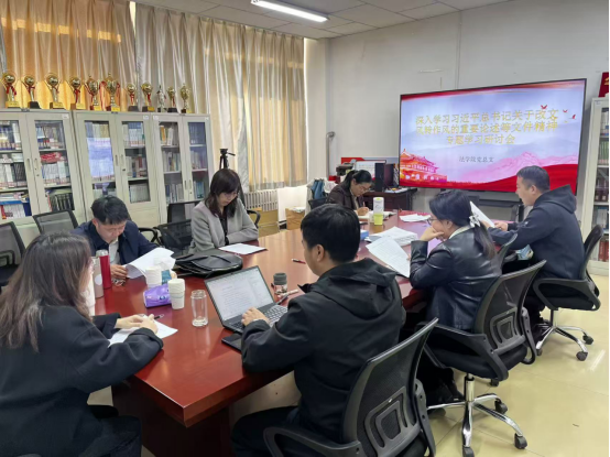 2025年10月30日下午,法学院在尚智楼会议室召开改文风转作风专题学习研讨会,由党总支书记乌兰其其格主持,8名教师党员参加。会议以“原文领学+案例剖析+交流研讨”形式,深入学习习近平总书记相关重要论述,系统解读“三个文件”精神。乌兰其其格结合本科教育教学审核评估实际,强调改文风转作风是践行“两个维护”的实际行动,重点解读《整治形式主义为基层减负若干规定》要求,明确“会议能合并则合并、文件能精简则精简”的执行标准。