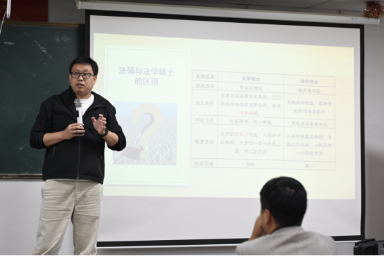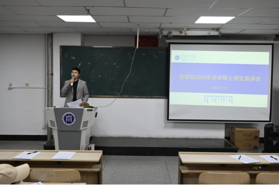 2025年10月16日晚7点,法学院举办2026年法律硕士研究生招生宣讲会。法学专业及学校其他专业120余名学生参加本次宣讲会。法学院副院长白木仁参加宣讲会,特邀硕成考研单小伟老师做报考辅导。