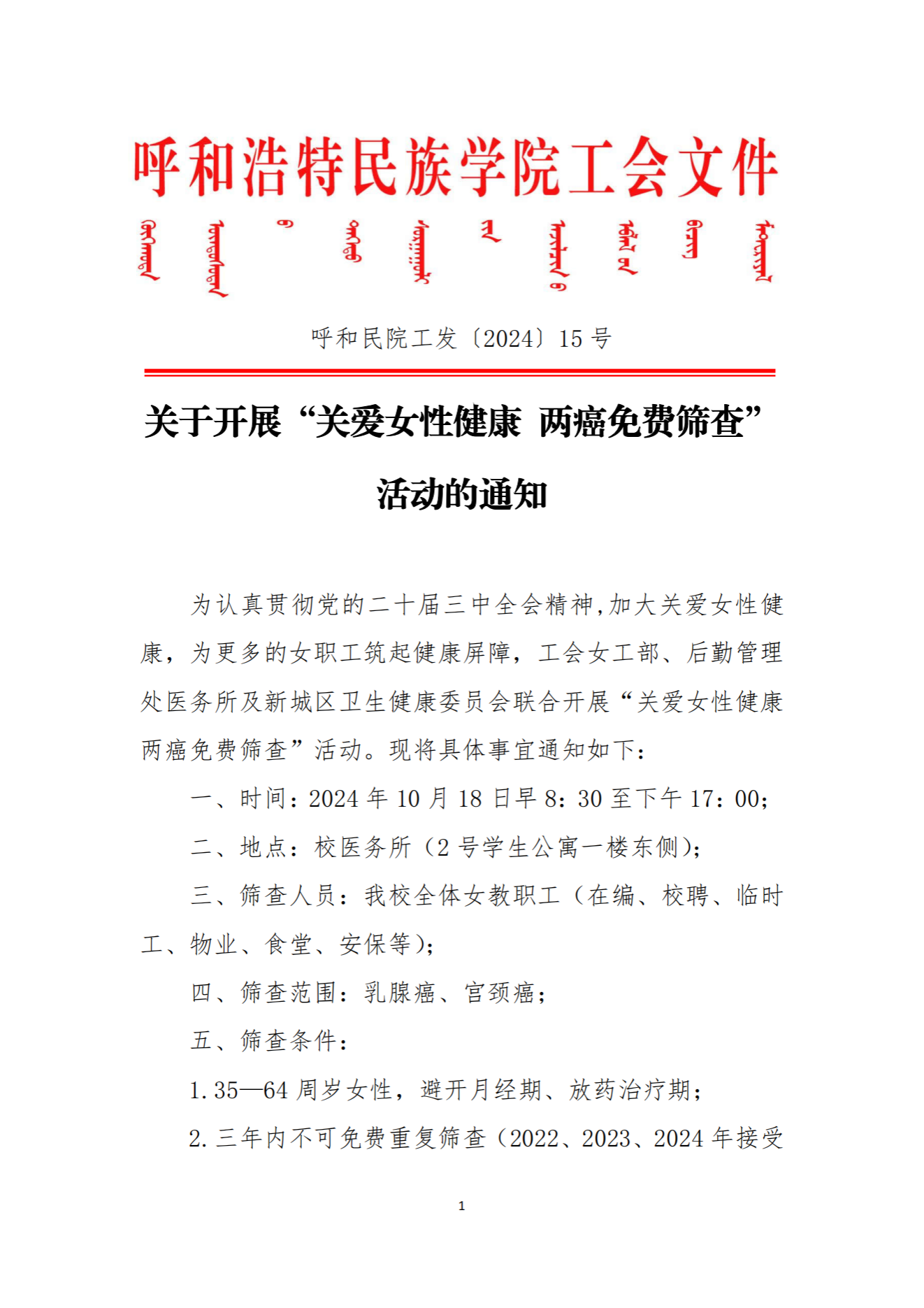 关于开展“关爱女性健康 两癌免费筛查”活动的通知