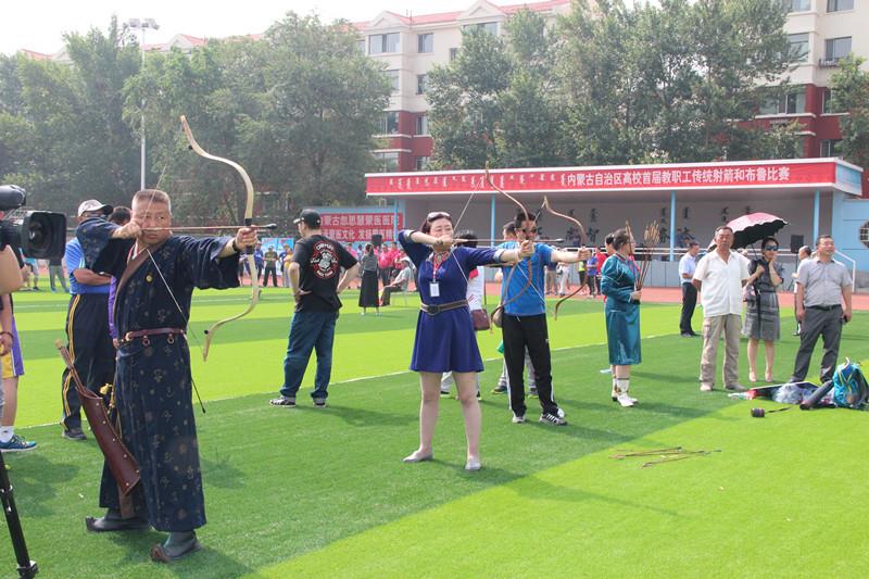 为更好地促进民族传统体育运动的普及与发展,丰富我区高等院校教职工文化体育生活,加强高校工会组织之间的学习交流,为期两天的内蒙古自治区高校首届教职工传统射箭和布鲁大赛,于2016年7月6日上午在beat365英国官方网站田径运动场隆重举行开幕式。