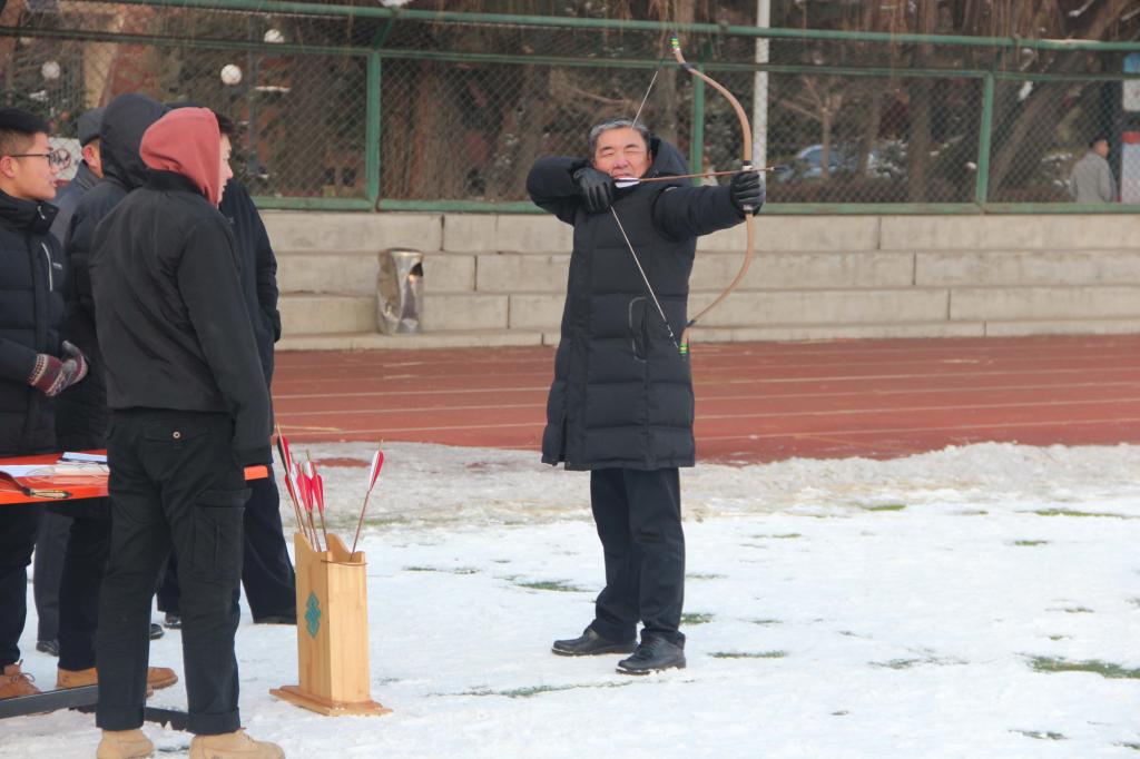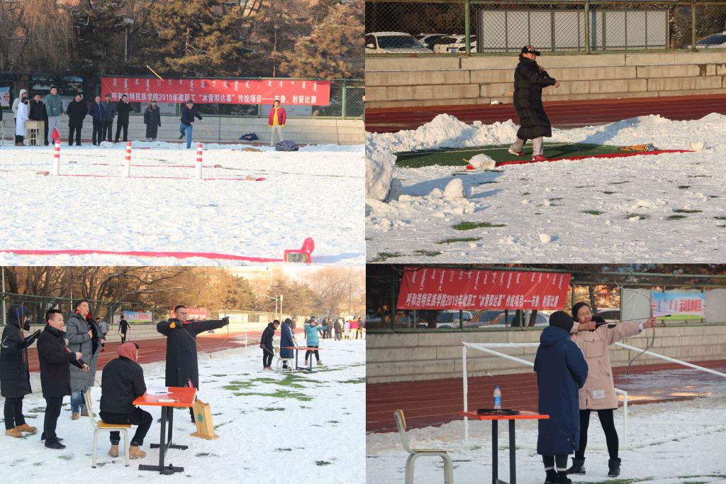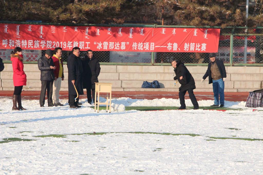 迎瑞雪丰年,享文化盛宴,为深入开展“不忘初心、牢记使命”主题教育,弘扬民族传统体育精神,传承民族传统体育项目,推进校园文化建设,12月17日下午,由校工会主办、体育学院分会承办的2019年教职工“冰雪那达慕”传统项目--布鲁、射箭比赛在体育场举行。校党委副书记、校长格日乐图,党委委员、副校长阿拉坦仓,党委委员、党政办主任朝格吉乐图和教职工参加了比赛。