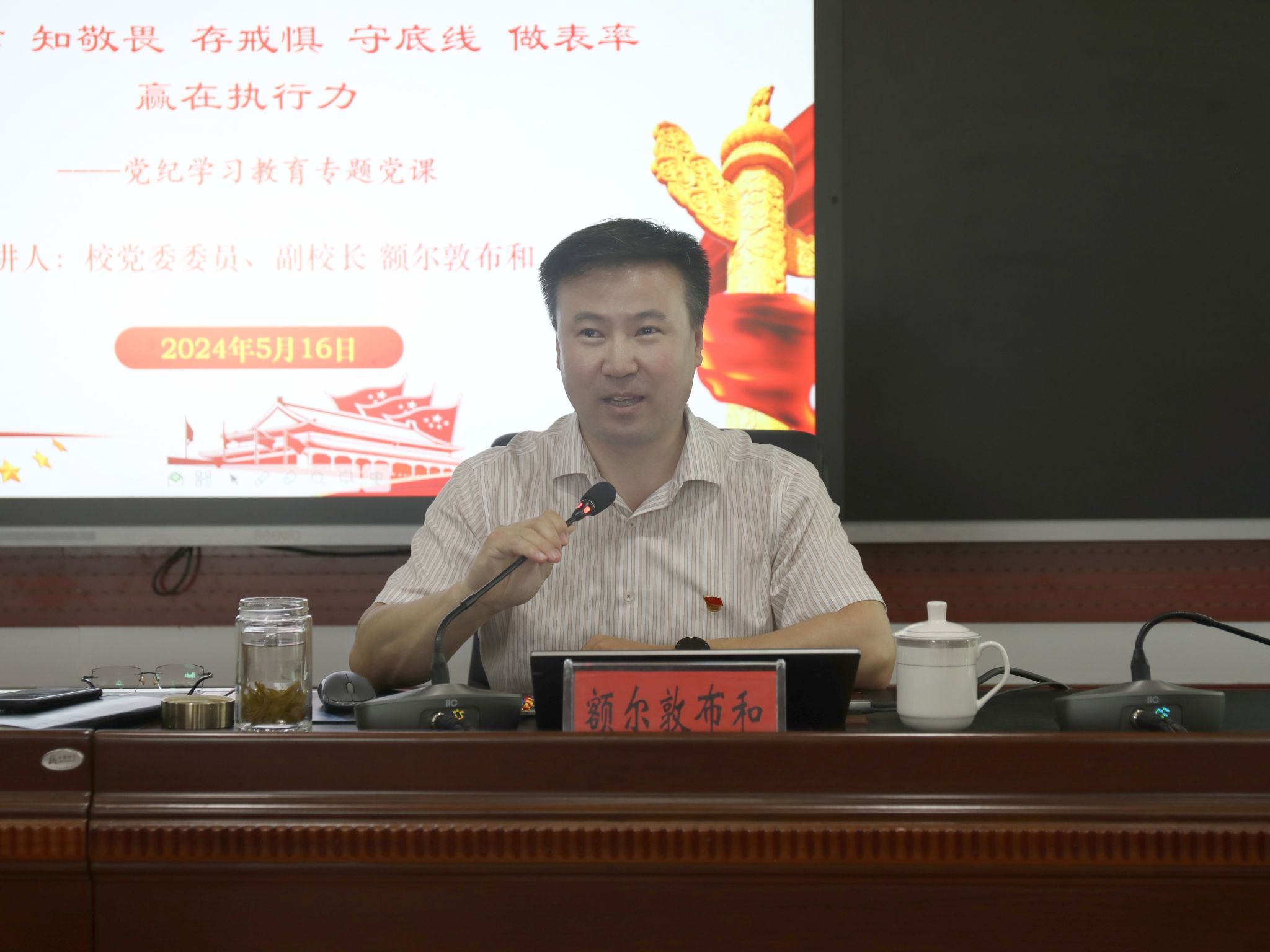 为深入学习贯彻习近平总书记关于党纪学习教育的重要讲话和指示精神,5月16日下午,校党委委员、副校长额尔敦布和以“明纪律 知敬畏 存戒惧 守底线 做表率 赢在执行力”为题讲授专题党课。