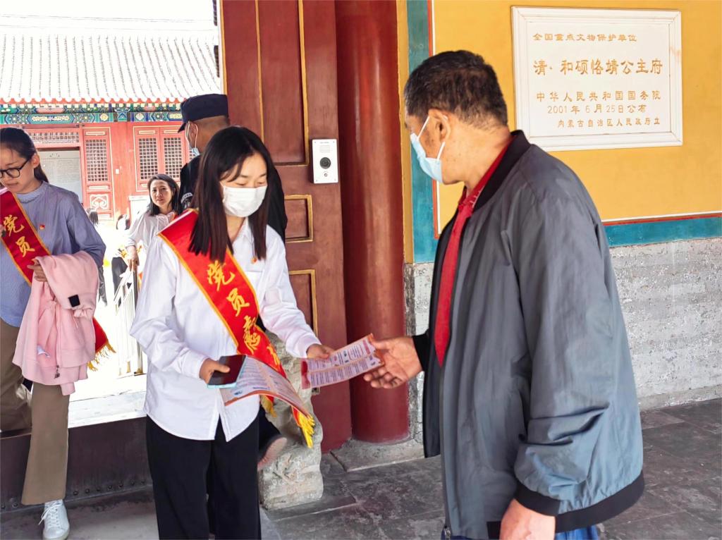 参观结束后,学院党总支副书记额尔敦格日乐带领教师与博物馆负责人进行了座谈,就安排志愿者服务、举办模拟导游比赛、开展实践教学、联合申报铸牢中华民族共同体意识研究项目、共同开发民族团结主题活动等事项进行了深入交流。随后,学生党员志愿者向游客和市民发放了《中华人民共和国国家通用语言文字法》《内蒙古自治区促进民族团结进步条例》《文物保护法》等法律法规宣传册500余份。