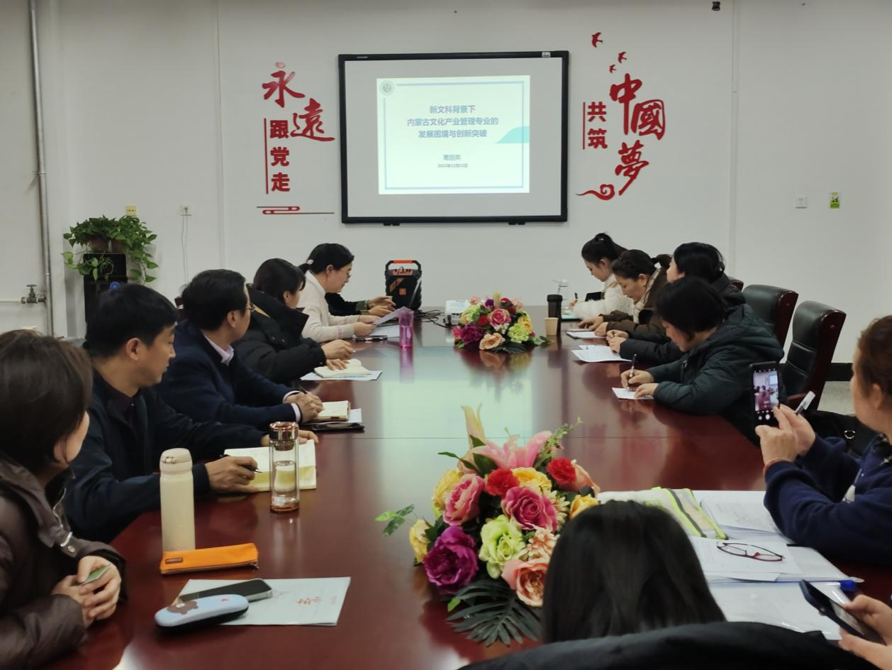 为进一步加强我院文化产业管理专业的高质量发展,12月14日,公共管理学院特别邀请了内蒙古艺术学院北疆艺术研究院常务副院长葛丽英教授作为主讲嘉宾,在尚智楼112会议室举办了《新文科背景下内蒙古文化产业管理专业的发展困境与突破》专题的前沿讲座。讲座由公共管理学院副院长额尔敦格日乐主持,文化产业管理教研室全体老师和部分没课任课老师参加。