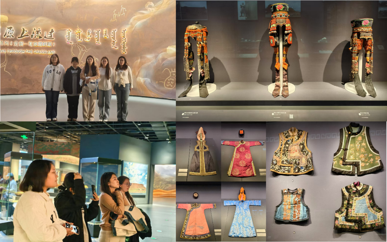 调研首站,学生们走进了鄂尔多斯市博物馆,通过丰富的藏品和生动的展览,深入了解了鄂尔多斯的历史文化,为后续的调研奠定了坚实基础。随后,团队深入乌审旗,实地探访多家民族服饰店。访谈中,学生们了解到传统蒙古袍的制作工艺、市场定位及面临的挑战,发现服饰店为迎合年轻市场,在保持传统的同时不断创新面料与设计。此番经历让学生们深刻体会到民族服饰文化在传承与创新中的平衡,认识到传统服饰既是民族文化的载体,也需与时俱进,融入现代元素,以焕发新的生命力。