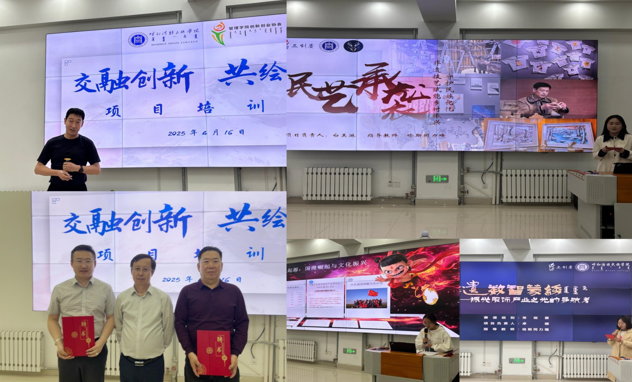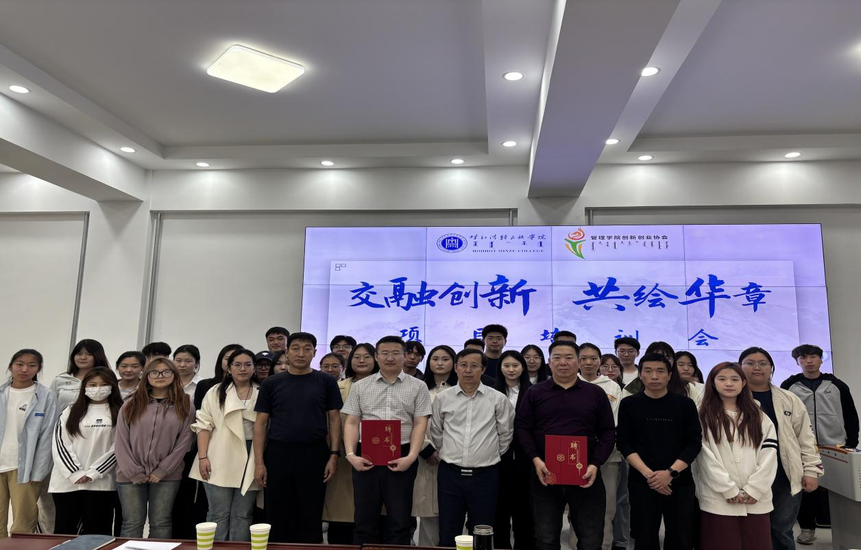 在本次活动中,学院为中国国际“互联网 +”大学生创新创业大赛全国评审专家库评审专家冯培禄教授与内蒙古蒙科立文化有限公司执行总经理斯钦图力古尔,举行了“创新创业导师”聘书颁发仪式。活动开场后,各项目团队依次进行精彩展示。两位导师结合北疆文化特色,现场给予细致点评,针对商业模式、市场定位等关键环节,提出了精准且具建设性的改进意见,现场气氛热烈,师生互动积极,为参赛项目注入了全新活力与灵感。
