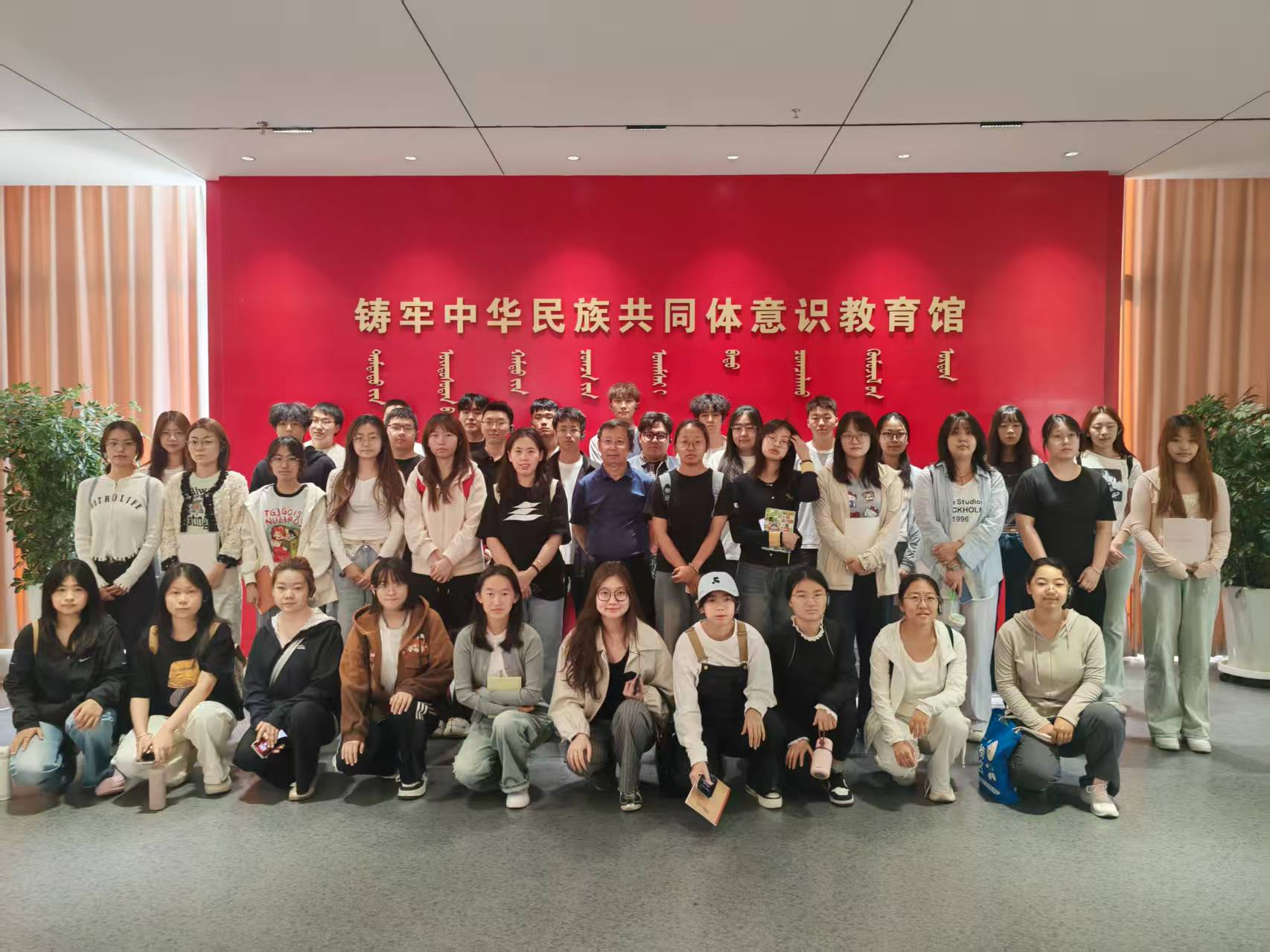 在哈斯同力嘎老师的引导下,同学们步入展厅。教育馆以铸牢中华民族共同体意识为主线,参照《中华民族共同体概论课》,以中华民族共同体的起源、形成和发展为脉络,由“我们从哪里来?”“我们是谁?”“我们要到哪里去?”三大部分构成。详实文献、珍贵影像与沉浸式场景还原相得益彰,生动呈现了中华民族从自在到自觉、迈向伟大复兴的壮阔征程。