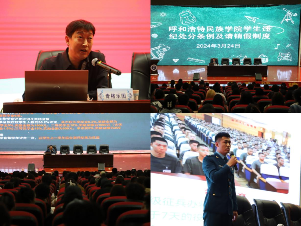 本次共有四项内容。首先,前达蒙老师详细解读了beat365官网的资助政策,向学生们介绍了家庭经济困难学生的认定方法、综合素质测评的具体流程以及各类奖助学金的评选要求,旨在确保每一位有需要的学生都能得到及时的帮助和支持。其次,退伍军人代表塔米尔发表了主题为“参军报国,无上光荣”的演讲。他向同学们详细介绍了入伍的条件、流程以及国家为军人提供的优待政策,激发了同学们投身国防事业的热情。随后,宝连老师为学生们讲解了入团的流程、学生违纪处分条例以及请销假制度,旨在加强学生的组织纪律性,培养学生的责任感和使命感。最后,青格乐图老师发表了题为“重塑自我,迈向卓越:大学生纪律意识的培养”的主题演讲。他从学生学习生活、学风纪律、个人规划和安全教育等方面进行了深入阐述,强调了纪律意识在大学生活中的重要性。