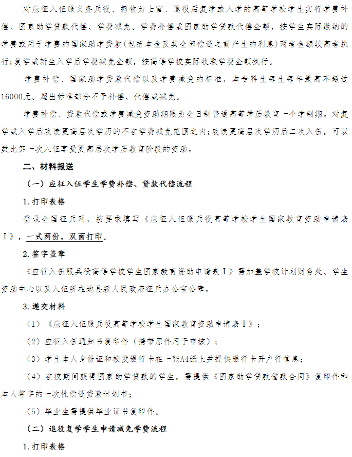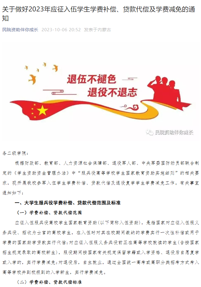 转载学校党委学生工作部(处)《关于做好2023年应征入伍学生学费补偿、贷款代偿及学费减免的通知》