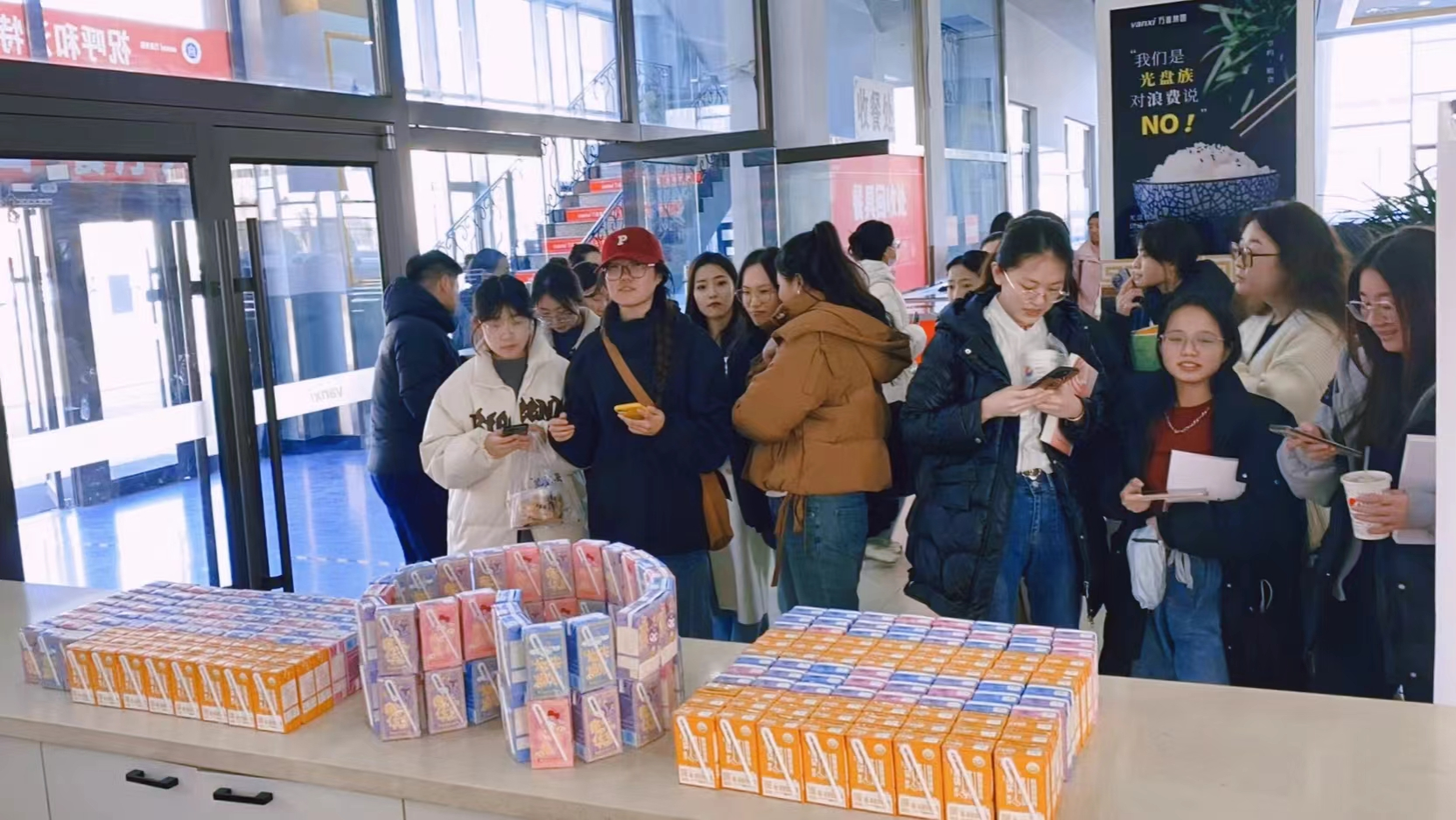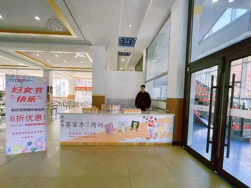 “三八”妇女节中午,后勤管理处餐饮服务中心在南区、北区餐厅一楼各设一处“三八节专属饮品发放窗口”,免费为beat365官网的女同学发放免费饮品,南区餐厅所有档口制定了优惠八折的特色菜品。南区教工餐厅也为前来就餐的女教职工提供了节日蛋糕。
