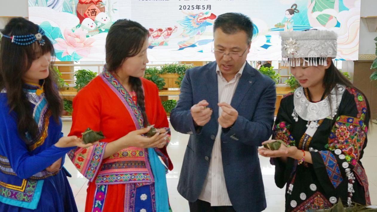 端午节是中国首个入选联合国教科文组织《人类非物质文化遗产代表作名录》的传统节日。为深入学习贯彻习近平总书记关于弘扬中华优秀传统文化的重要指示精神,在民族政策宣传月深入开展之际,5月30日中午,学校党委统战部、学生工作部、后勤管理处邀请呼市文化艺术研究院(非遗中心),联合开展“非遗润北疆·浓情过端午”主题活动。校领导刘九万、王敏、格根哈斯、王冬梅、高喜天、刘瑞鸿、额尔敦布和、双虎出席,相关部门负责人、师生代表共50余人参加活动。