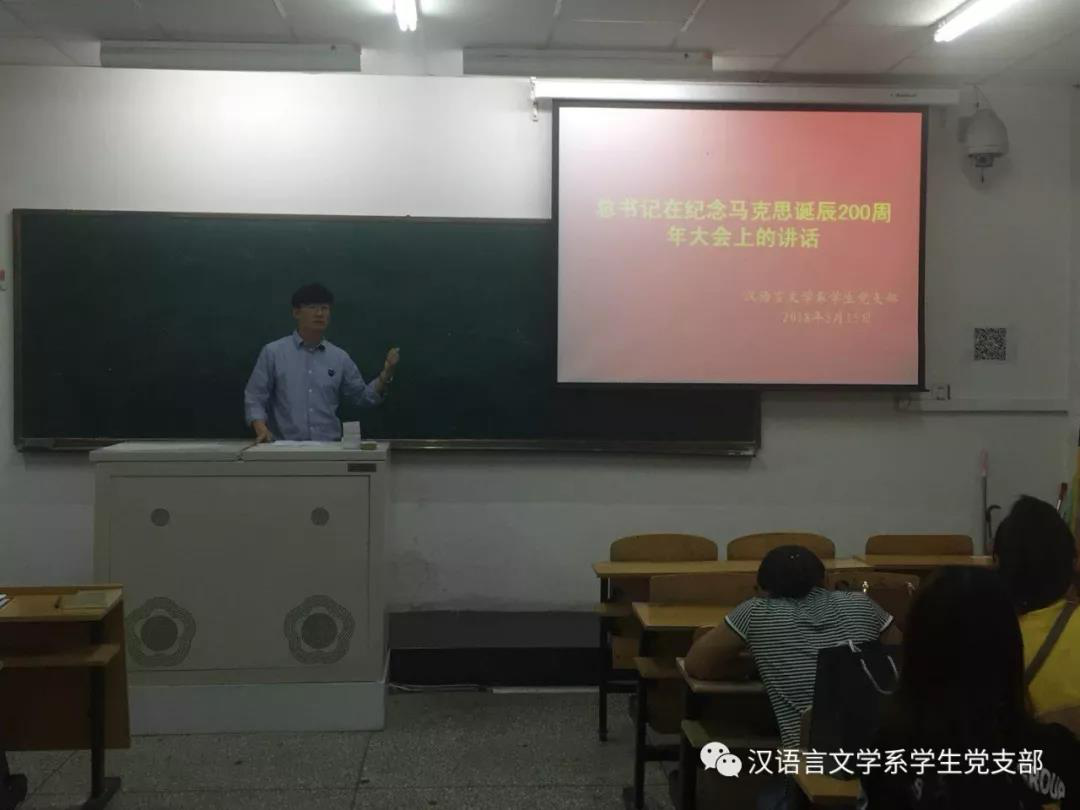 为深入学习“总书记在纪念马克思诞辰二百周年大会上的讲话”,5月15日下午七点半,汉语言文学系学生支部在南区教学楼105教室开展了题为“总书记在纪念马克思诞辰200周年大会上的讲话”政治理论学习活动。学生支部书记张子涵老师给全体学生党员进行深入讲解,全体学生党员参加了此次政治理论学习。
