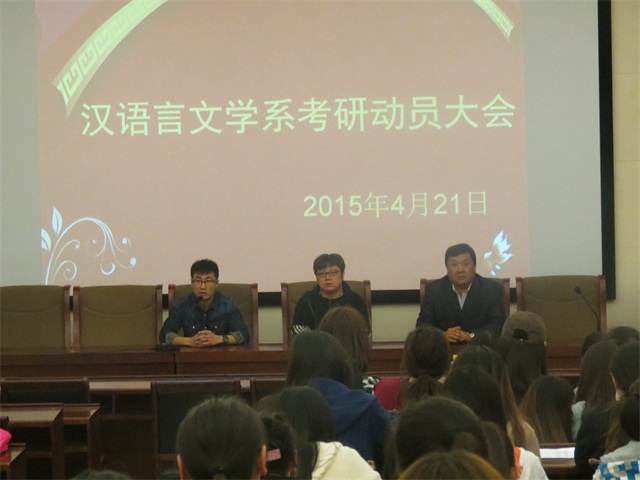 为进一步加强汉文系学风建设,激发汉文系学生的考研积极性,2015年4月21日晚7点,汉语言文学系考研动员大会在学院图书馆一楼报告厅顺利举行。系党总支书记赛音图、系副主任许丽、系团总支副书记张子涵及全体小学教育专业同学参加本次动员大会。大会由系团总支副书记张子涵主持。
