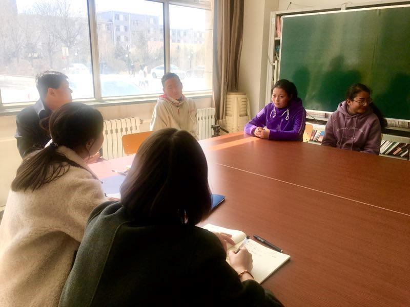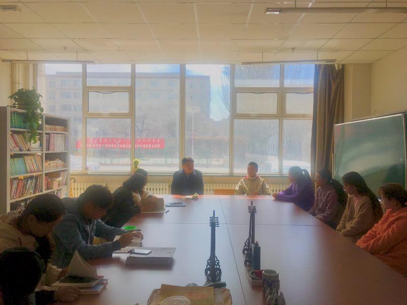 2019年3月22日中午12:30在综合楼101实训室召开汉语言文学系藏族学生座谈会。系党总支书记赛音图,团总支书记张子涵,辅导员刘晓、雷娜庆以及7名藏族同学参加本次座谈会。