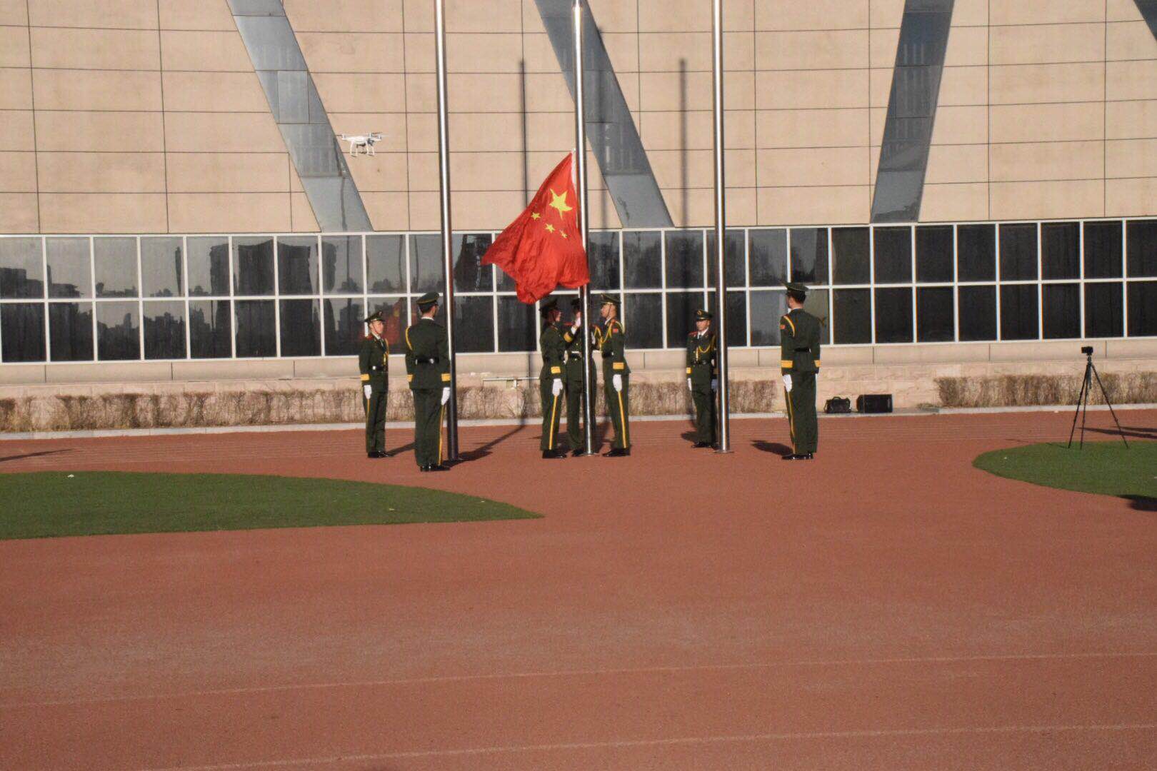沐浴在晨晖下,我系学生站定为一个方阵,伴随着音乐的响起,为全校师生呈现声情并茂的精彩朗诵。在“五星红旗,荣光闪耀,代代相传!荣光闪耀,代代相传……”铿锵有力的余音中,朗诵完毕,激昂的朗诵震撼着在场所有师生的心!最后在飞扬的红旗下,全体学生高举“五星红旗您是我的骄傲,五星红旗我为您自豪”的标语,使现场爱国气氛更加浓郁。