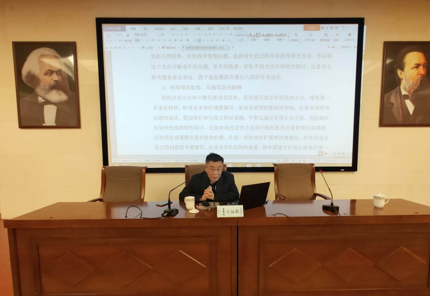 5月30日下午,文学院在图书馆一楼报告厅举办学术讲座。中央民族大学二级教授、博士生导师,北京市(青年)学科带头人、教育部中国民族问题研究中心教授王远新为文学院全体师生作了题为《可持续性语言研究问题的几点看法》的讲座。本次讲座由文学院杜勍妹教授主持,文学院180余名师生聆听了讲座。